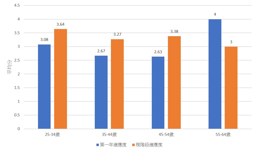圖四顯示不同年齡層在適應能力上的差異,年長族群(55-64歲)初期適應度最高,但現階段適應度下降,可能受健康或環境影響。年輕族群(25-34歲)初期適應度中等,但現階段提升幅度最大。中年族群(35-54歲)適應能力穩步提升,特別是45-54歲提升幅度最大,展現出較高的後續適應能力。整體來看,年輕與中年族群隨時間適應能力增強,而年長族群則需額外支持以應對後期挑戰。