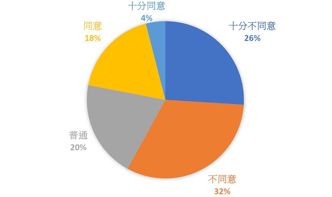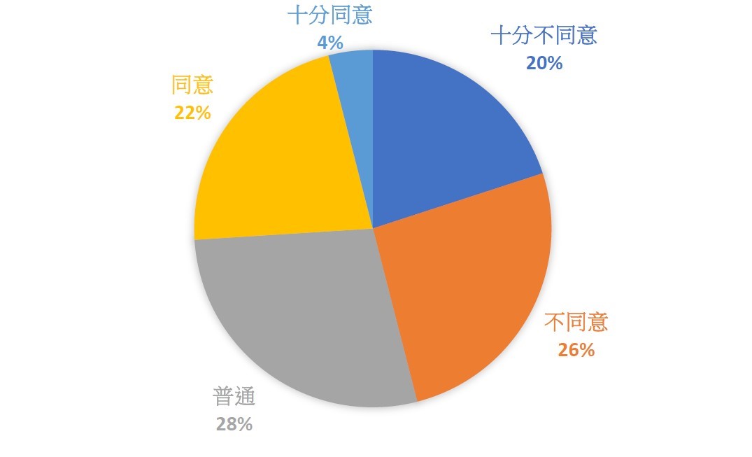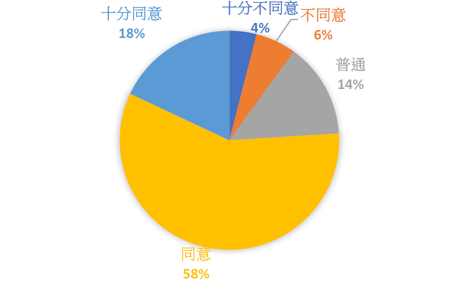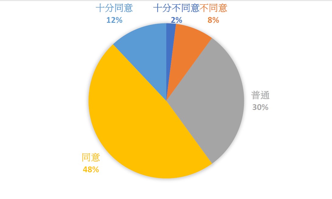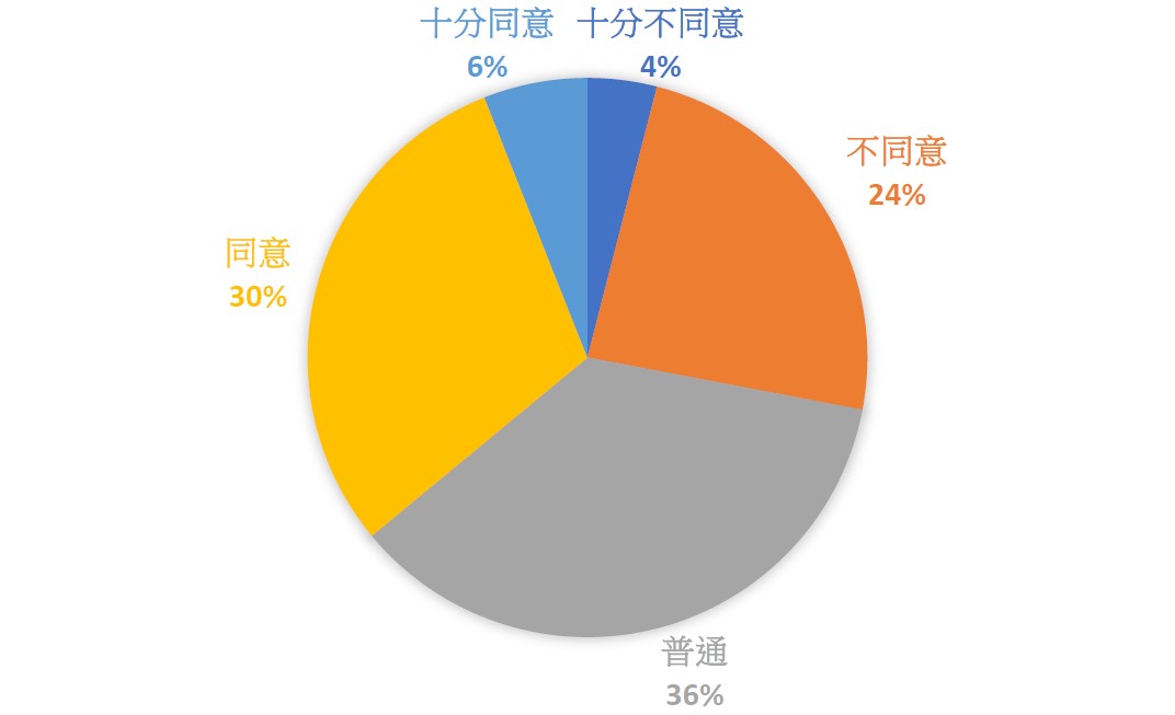 圖七呈現了受訪者對於「我經常與長執溝通和分享事工需要和發展」這個回應分佈,當中「普通」佔最大比例,為36%;「同意」佔30%;「不同意」佔24%;「十分同意」佔6%;「十分不同意」佔4%。從數據可以看出,對於「與長執溝通和分享事工需要和發展」這一說法,持中立態度(「普通」)的人佔比最高。而總體而言,持正面態度(「同意」和「十分同意」)的受訪者共佔36%,略高於持負面態度(「不同意」和「十分不同意」)的受訪者總和28%,這反映了新手牧者與長執之間的溝通確實處於一般水平,需要進一步加強。