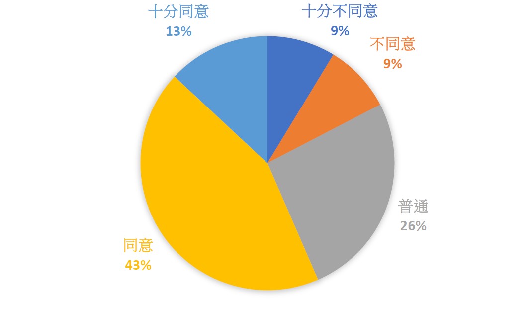 當中僅56%的員工認為能與同工建立良好關係(43%同意,13%十分同意);有18%的員工對同工關係持負面評價(9%十分不同意,9%不同意);普通評價的比例較高(26%),這顯示同工關係不佳可能是促使新手牧者產生離職意向的因素之一。
