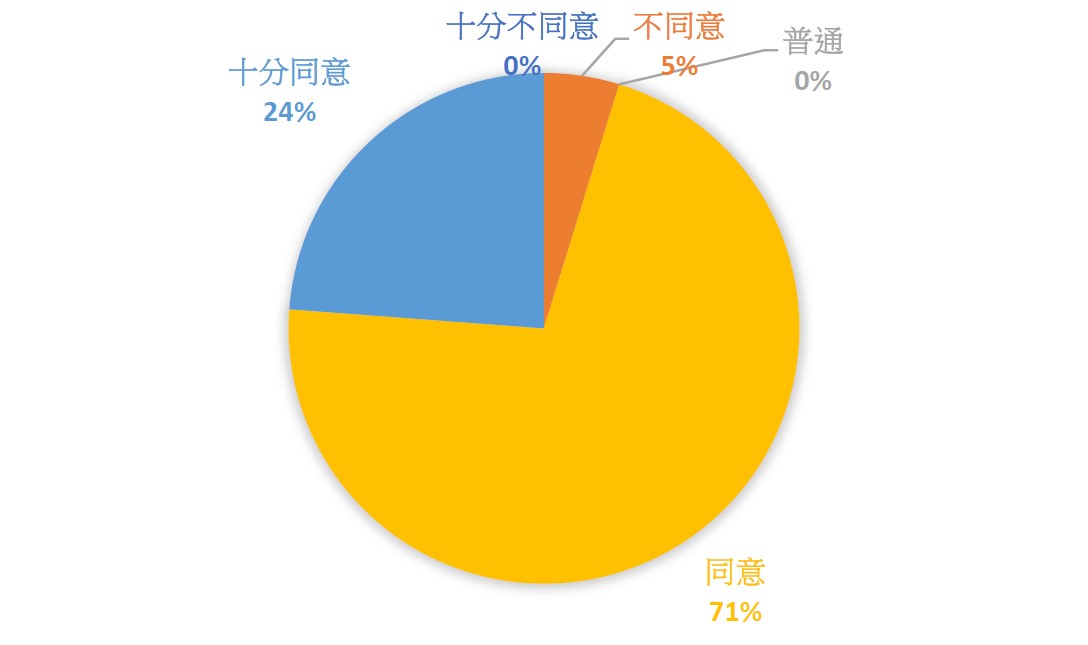 按資料顯示,高達95%的受訪者表示能與同工建立良好關係(71%同意,24%十分同意);幾乎沒有受訪者對同工關係持負面評價(0%十分不同意,5%不同意);普通評價的比例極低(0%),這表明良好的同工關係是留任的重要因素。