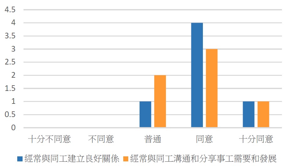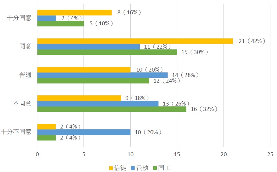 • 「十分不同意」和「不同意」:沒有人選擇「不同意」或「十分不同意」,顯示少數人認為牧者未能與同工建立良好關係或進行有效溝通。