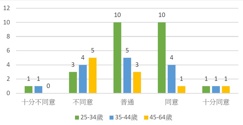 從圖表可見,不同年齡層牧者與長執溝通情況存在明顯差異。25-34歲牧者大多持正面態度,選擇「同意」的人數最多,表示他們積極與長執溝通分享事工需要。35-44歲牧者則呈現較為平均分布,「普通」選項略高,顯示中立態度較普遍。45-64歲牧者則有較多人選擇「不同意」,反映年長的新手牧者可能在與長執溝通上面臨更多挑戰。