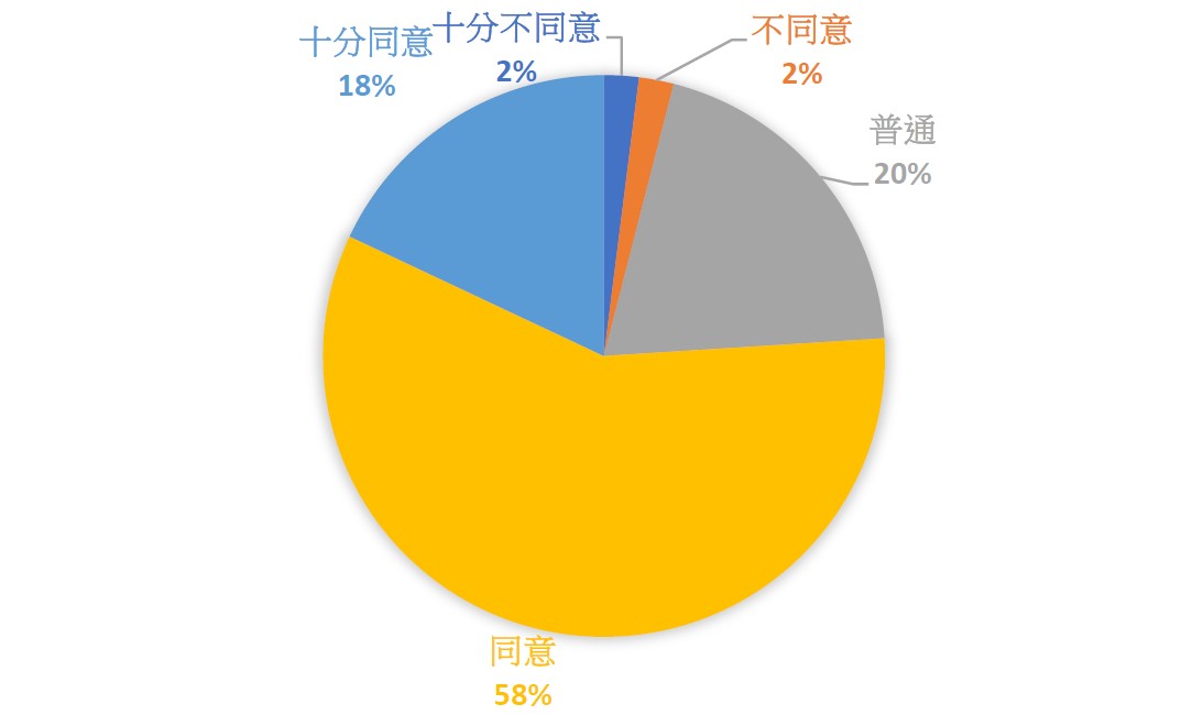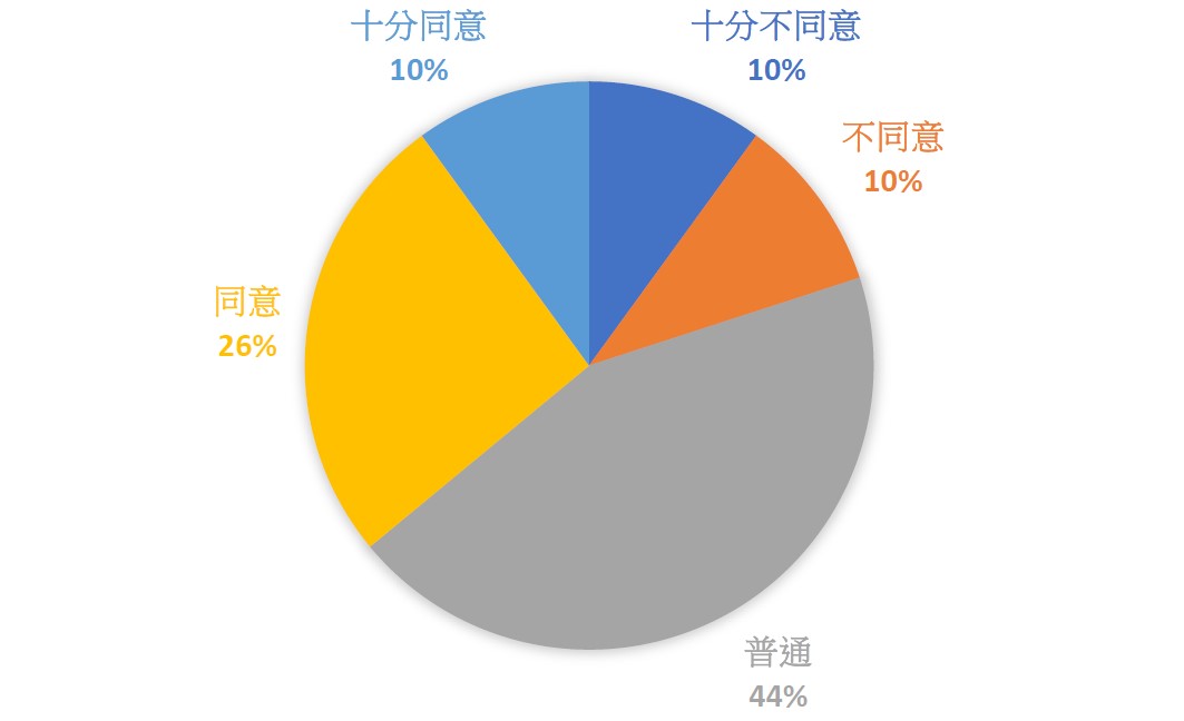 圖一呈現了受訪者對於「我能與同工建立良好的關係」這個回應的分佈,從數據顯示正面回應佔多數,有76%(18% 十分同意,58% 同意) 的受訪者認為自己能夠與同工建立良好的關係,顯示出大多數人在與同工的相處中感到滿意。