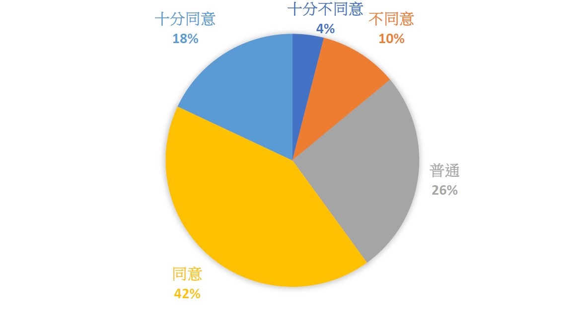 圖四顯示了受訪者對於「我經常與同工溝通和分享事工需要和發展」這個回應的分佈,從數據可見正面回應佔多數,有60%(18% 十分同意,42% 同意) 的受訪者認為自己經常與同工溝通並分享事工需要和發展,顯示出大多數人在這方面的互動較為積極。另外,有26% 的受訪者持「普通」評價,表明他們可能認為此項溝通頻率尚可。然而,有14%(10% 不同意,4% 十分不同意)的受訪者感到自己在與同工溝通事工需要和發展方面持負面的回應,可能因缺乏時間、方法或溝通管道不暢等原因。