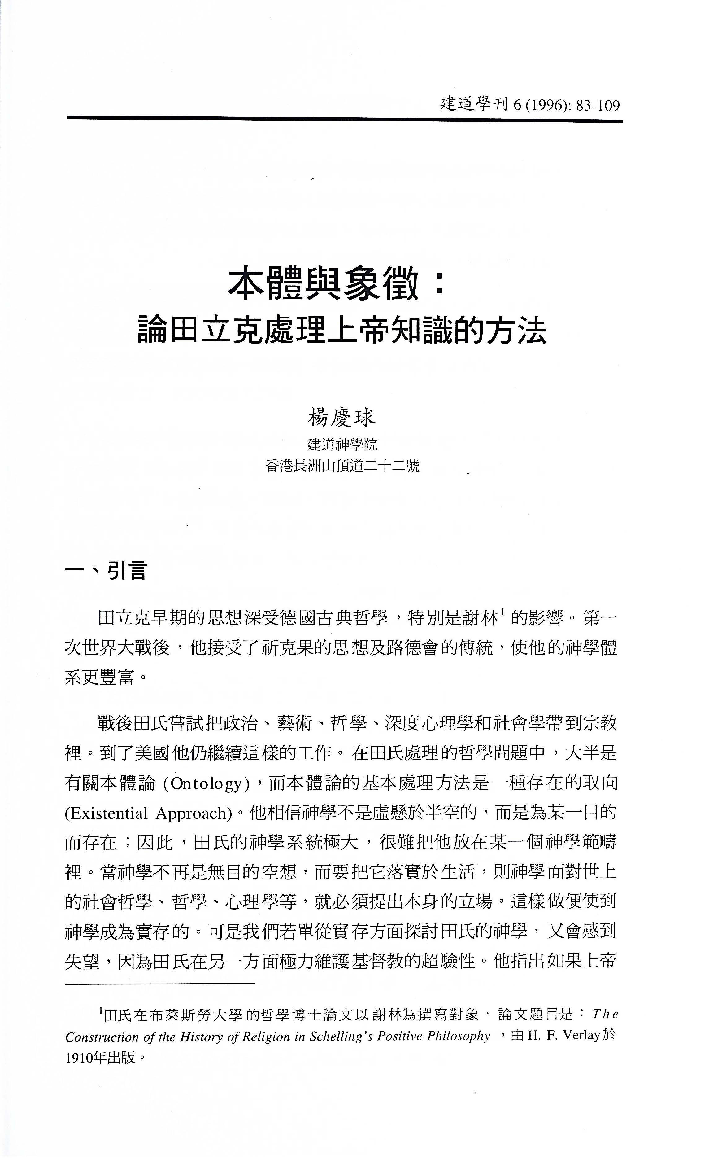本體與象徵──論田立克處理上帝知識的方法 / 楊慶球