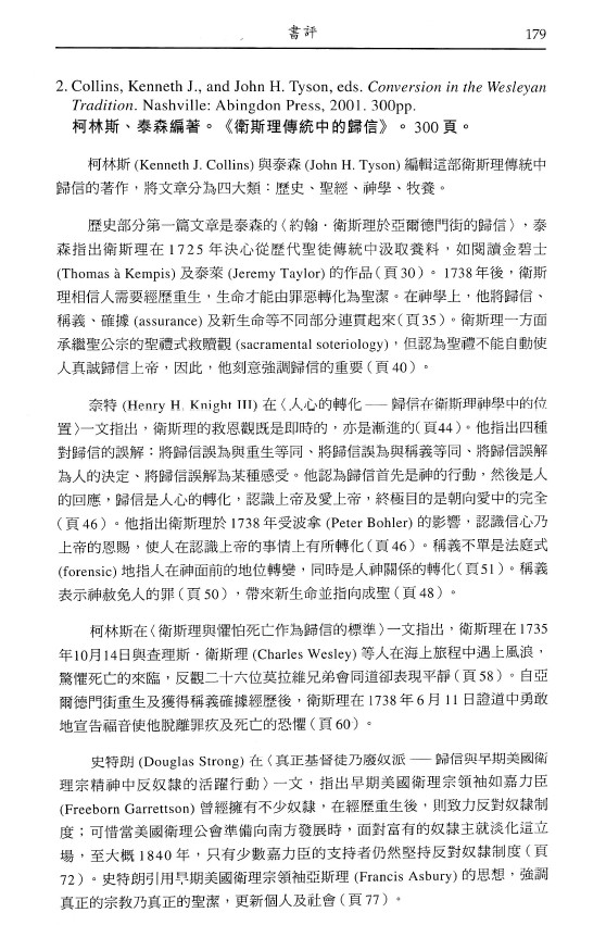 柯林斯、泰森編著。《衛斯理傳統中的歸信》。(Collins, Kenneth J., And John H. Tyson, eds. Conversion In The Wesleyan Tradition.)/郭鴻標