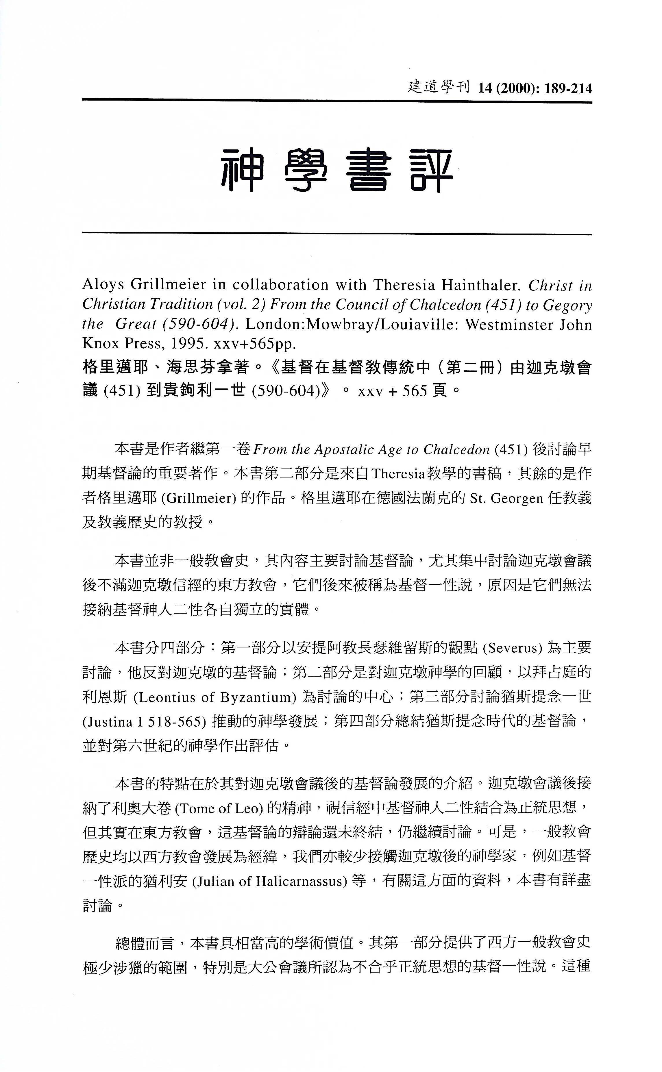 格理邁耶、海恩芬拿。《基督在基督教傳統中(第二冊)由迦克墩會議 (451) 到貴鉤利一世 (590-604)》。[Aloys Grillmeier In Collaboration With Theresia Hainthaler. Christ In Christian Tradition (Vol. 2) From The Council Of Chalcedon (451) To Gegory The Great (590-604)] / 楊慶球