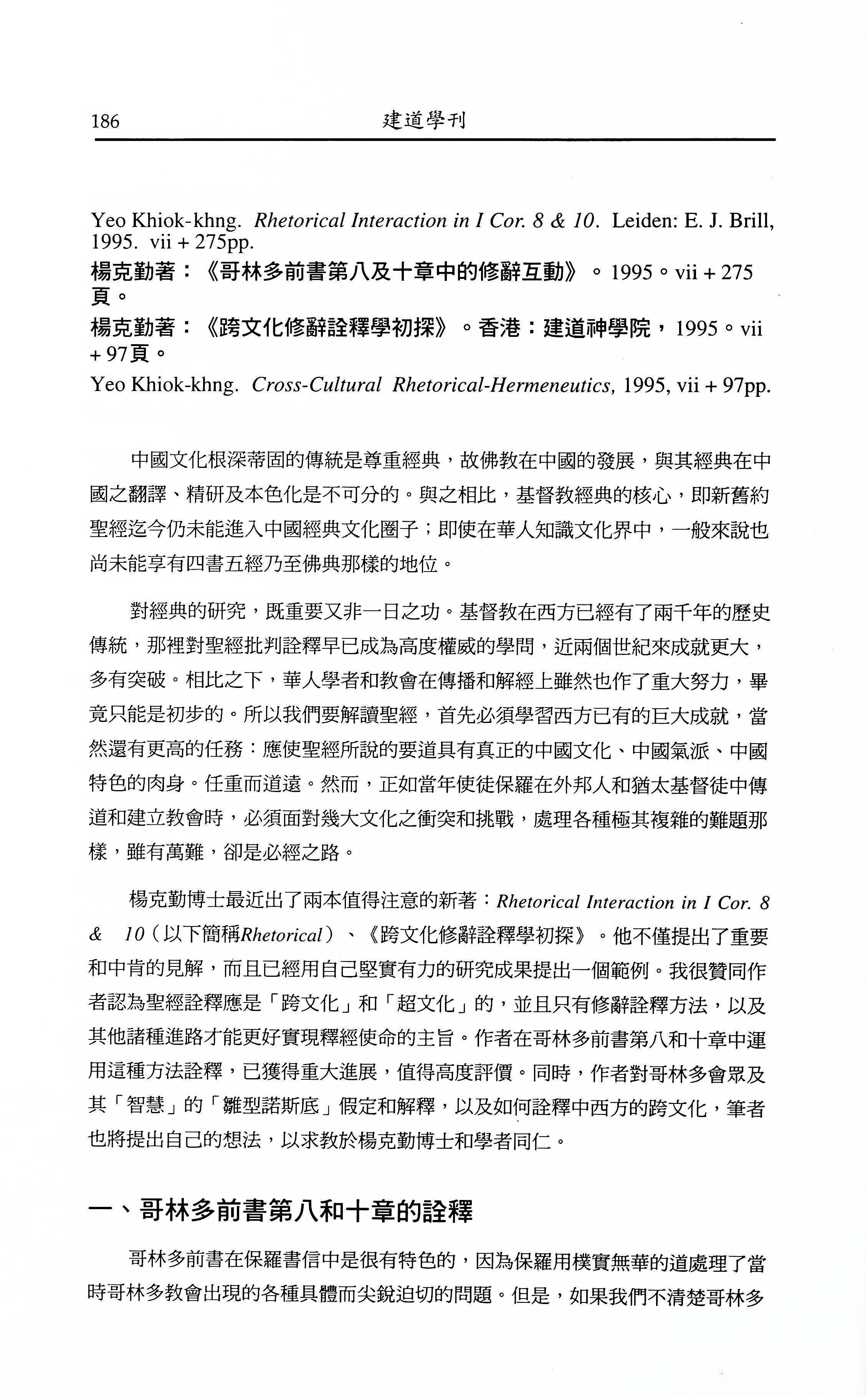 楊克勤。《哥林多前書第八章及十章中的修辭互動》。(Yeo, Khiok-Khng. Rhetorical Interaction In 1 Cor. 8 & 10.) / 楊適