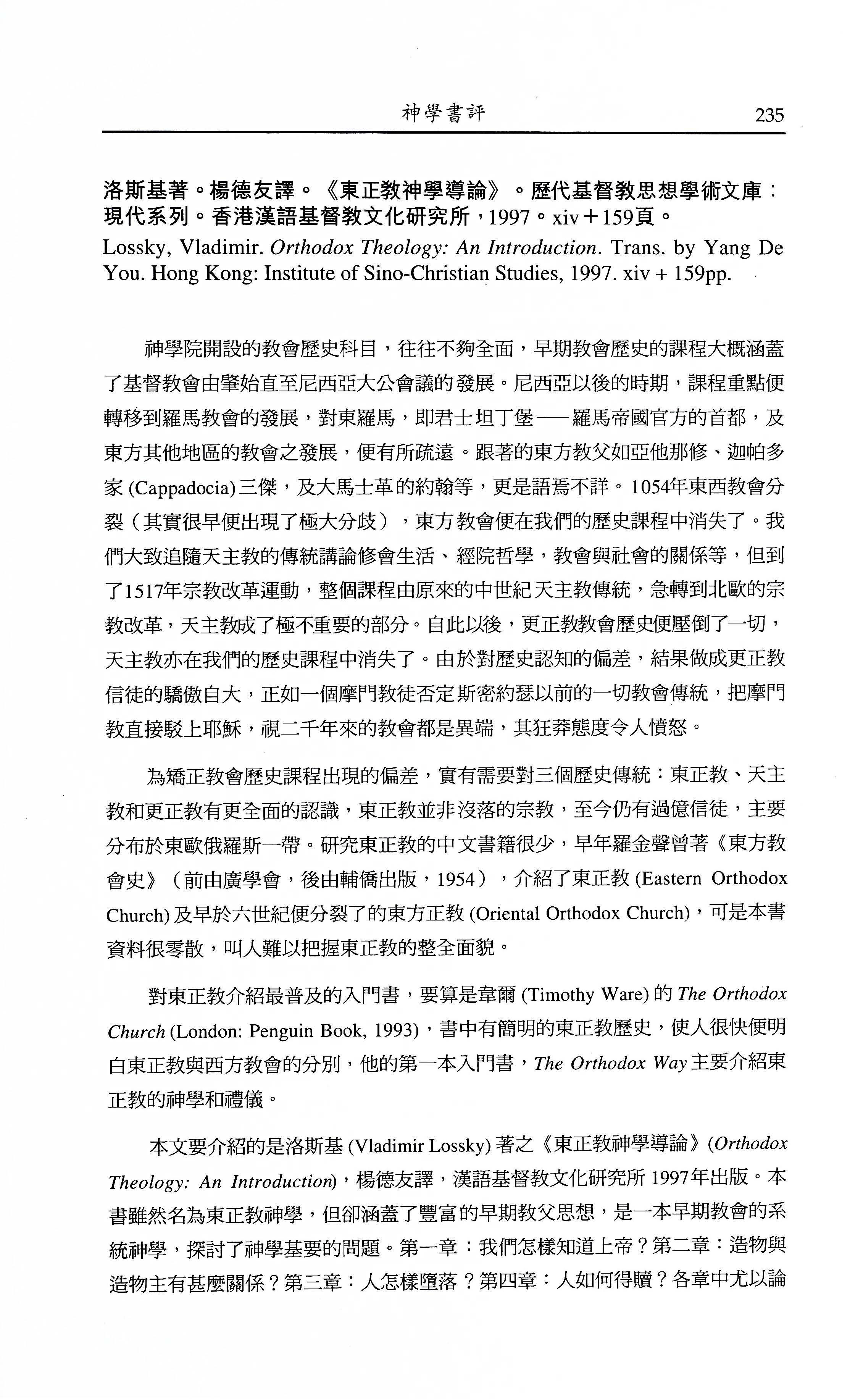 洛基斯著。楊德友譯。《東正教神學導論》。(Lossky, Vladimir. Orthodox Theology: An Introduction. Translated by Yang De You.) / 楊慶球
