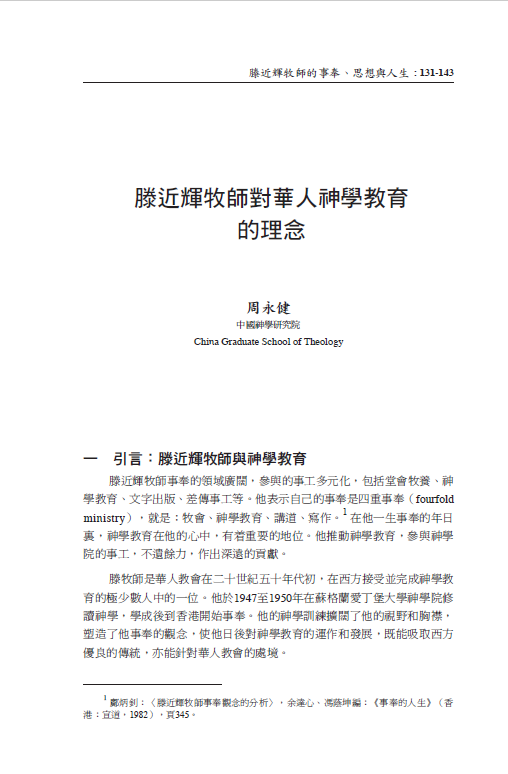 滕近輝牧師對華人神學教育的理念/周永健
