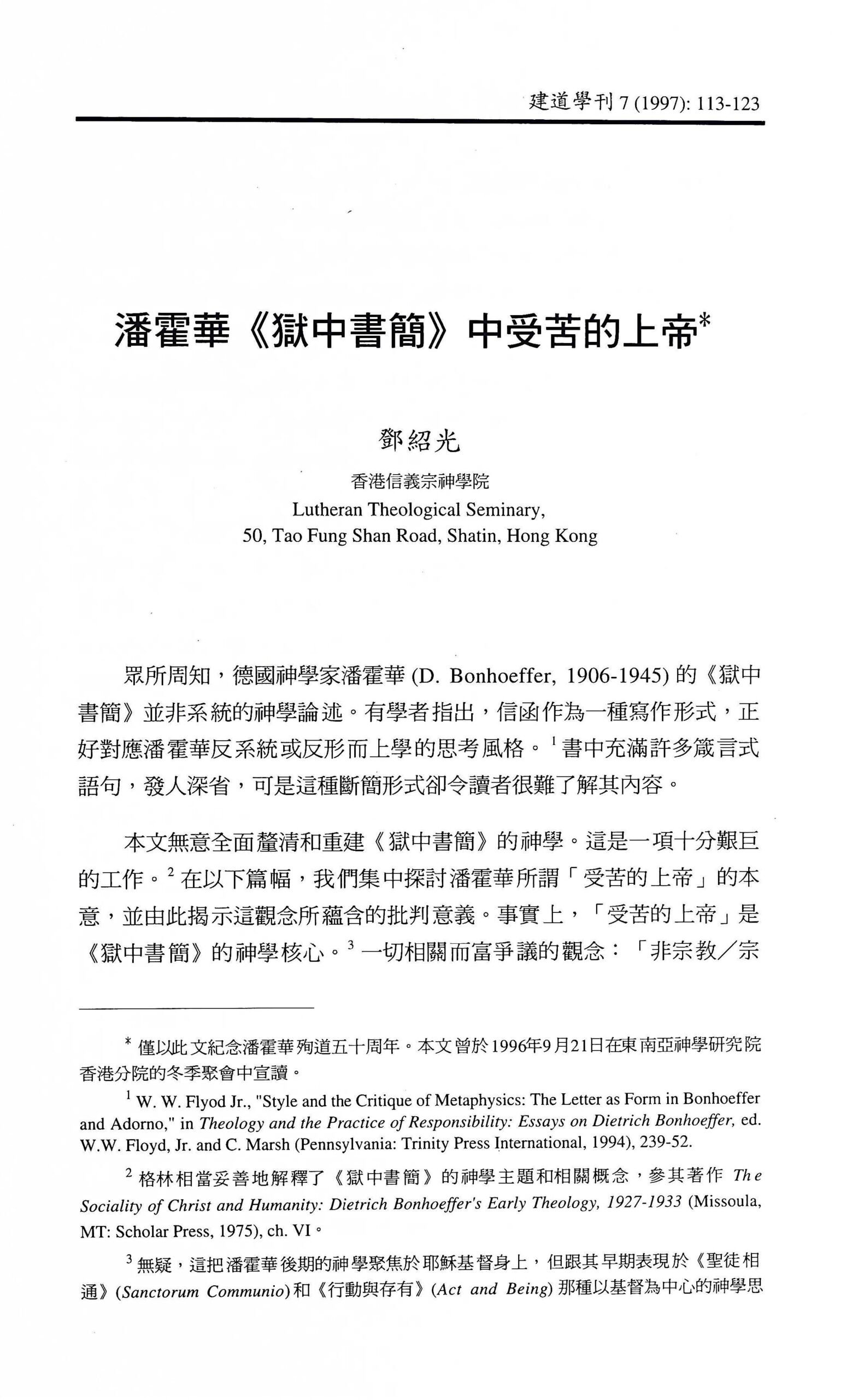 潘霍華《獄中書簡》中受苦的上帝 / 鄧紹光