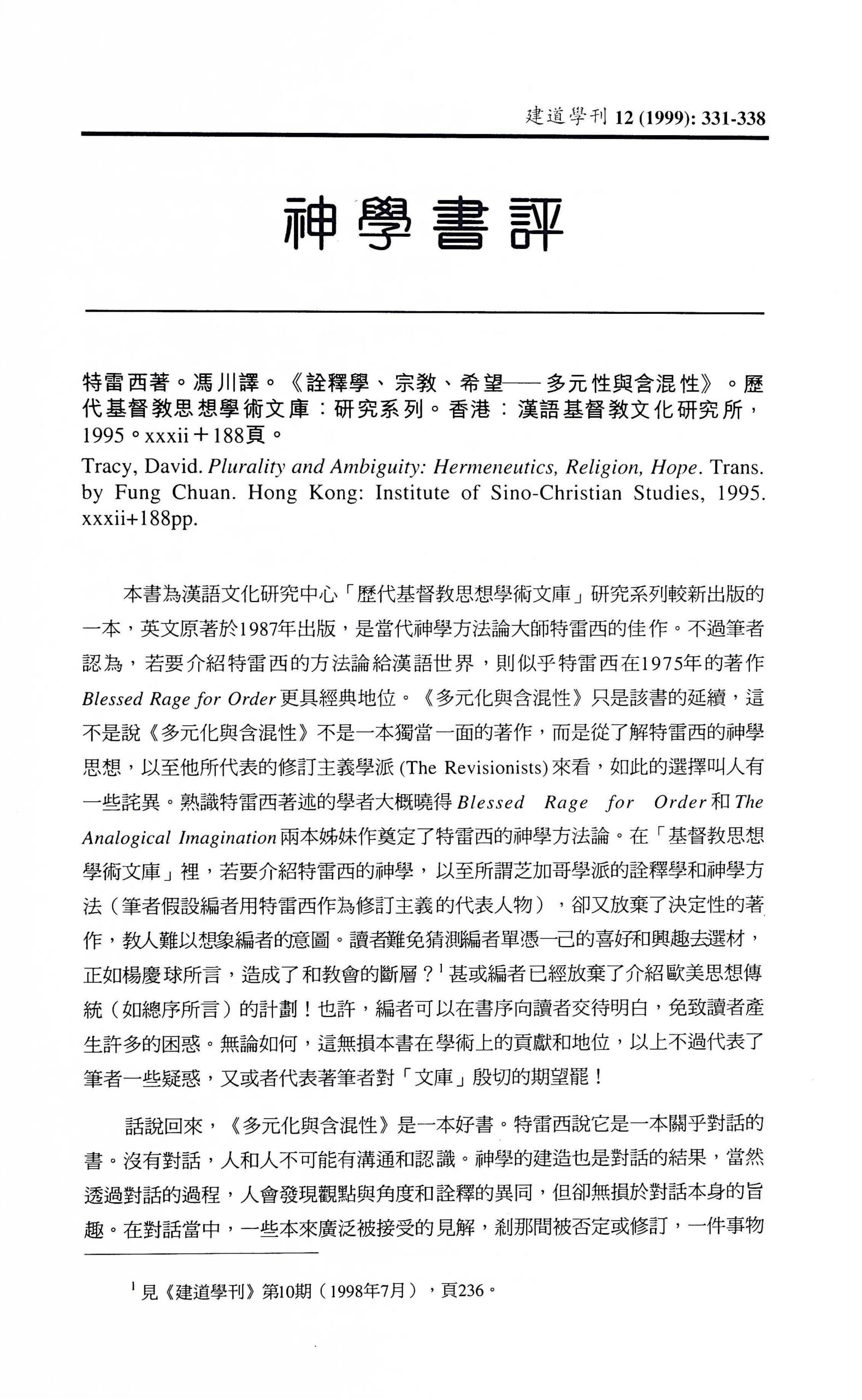 特雷西著。馮川譯。《詮釋學、宗教、希望──多元性與混合性》。(Tracy, David. Plurality and Ambiguity: Hermeneutics, Religion, Hope.) / 湯紹源