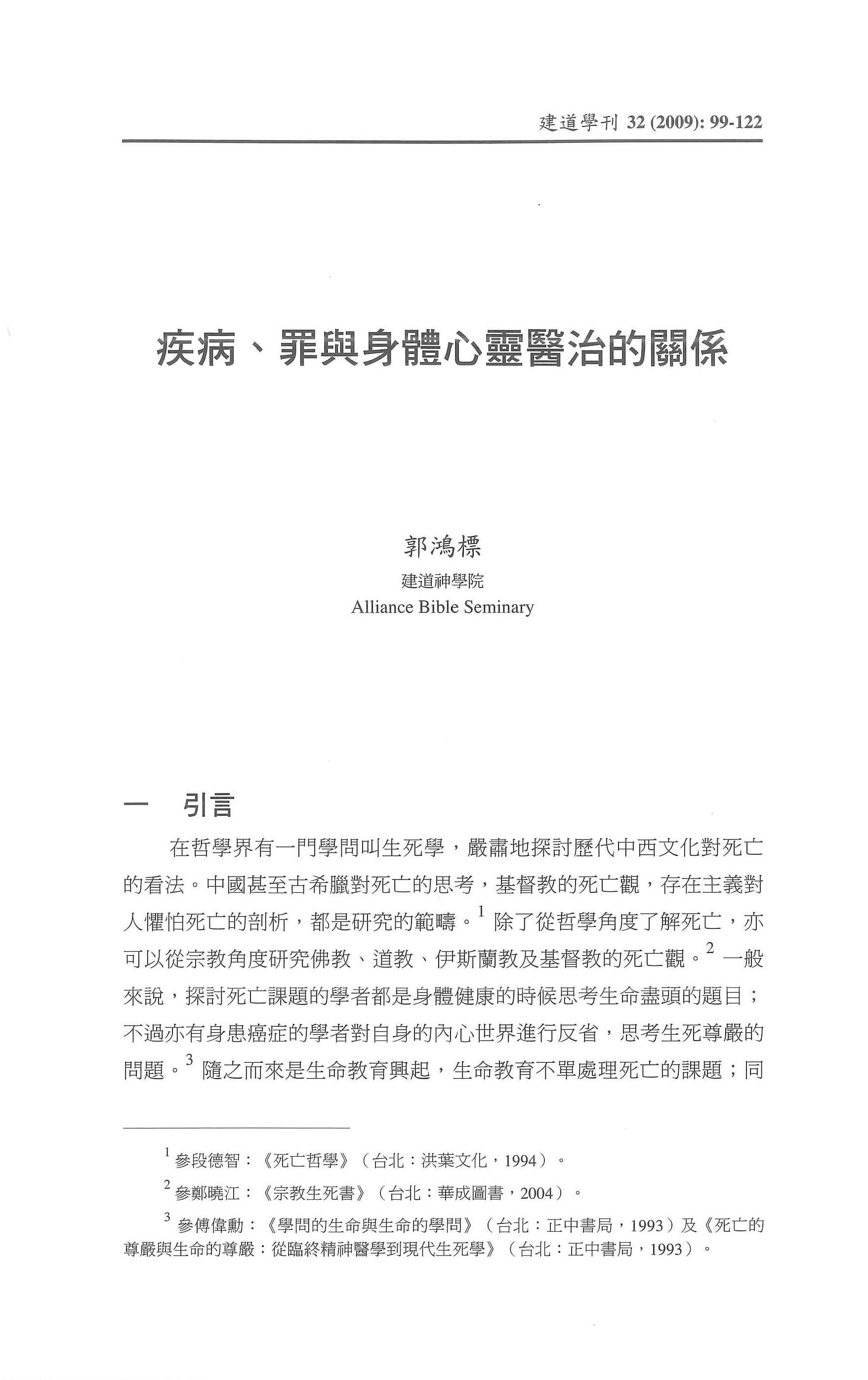 How is the relation between illness and sin? This paper is going to review current Roman Catholic, Eastern Orthodoxy and protestant’s discussion about sin and illness. Most scholars think that illness is not necessary the punishment of personal wrongdoings, however all the humankind live under the situation of fall and are living under the control of sinful power. After the Enlightenment,we choose humanistic point of view to interpret the activities in the world, but neglect the role of religion. The study of the issue of the relationship between sin and illness is always prioritized the bodily need, but forgetting the psychological and spiritual factors behind, especially what Christians regard as sin.How does sin control humankind? How could humankind get healed? Does healing has only physical dimension or included spiritual dimension? How could we understand prayer in some cases get response, but sometimes get no answer? If everyone lives under the control of sin, how could our spiritual life get healing? The focus of this paper is to understand the relationship between sin and spiritual healing theologically. This paper is divided into four parts: firstly the relationship between sin and illness. Secondly, from the lordship of God to understand prayer get healing and not being healed. Thirdly, the issue of spiritual healing. Fourly, the healing mission of Jesus Christ.