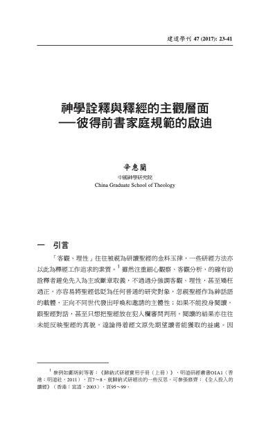 神學詮釋與釋經的主觀層面——彼得前書家庭規範的啟迪/辛惠蘭