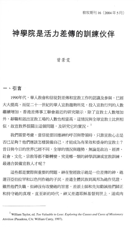 香港差傳事工聯會的研究顯示,除了宣教士人數增加外,辭職和退出宣教工場的人數也相當高。當信徒要回應神的呼召與帶領時,他們應該怎樣裝備自己,才能成為有果效和委身的宣教士?究竟哪一類的神學訓諫或宣教訓練,最適合裝備宣教人才呢?本文從聖經了解耶穌怎樣訓練祂的門徒,研究及思考神學院如何成為活力差傳的訓練伙伴。本文探討耶穌的活力訓練,分析神學院的活力訓練。神學院要提供宣教訓練與裝備,教會、差會和宣教士則要好好建立關係及互相合作,特別要衝破差傳鐵三角的限制,建立四柱關係。神學院和教師不只停留在某階段的訓練模式,卻要走到宣教工場的前線,同時也透過參與國際宣教會議,也包括校友網絡,同心擴展差傳與宣教的工作。