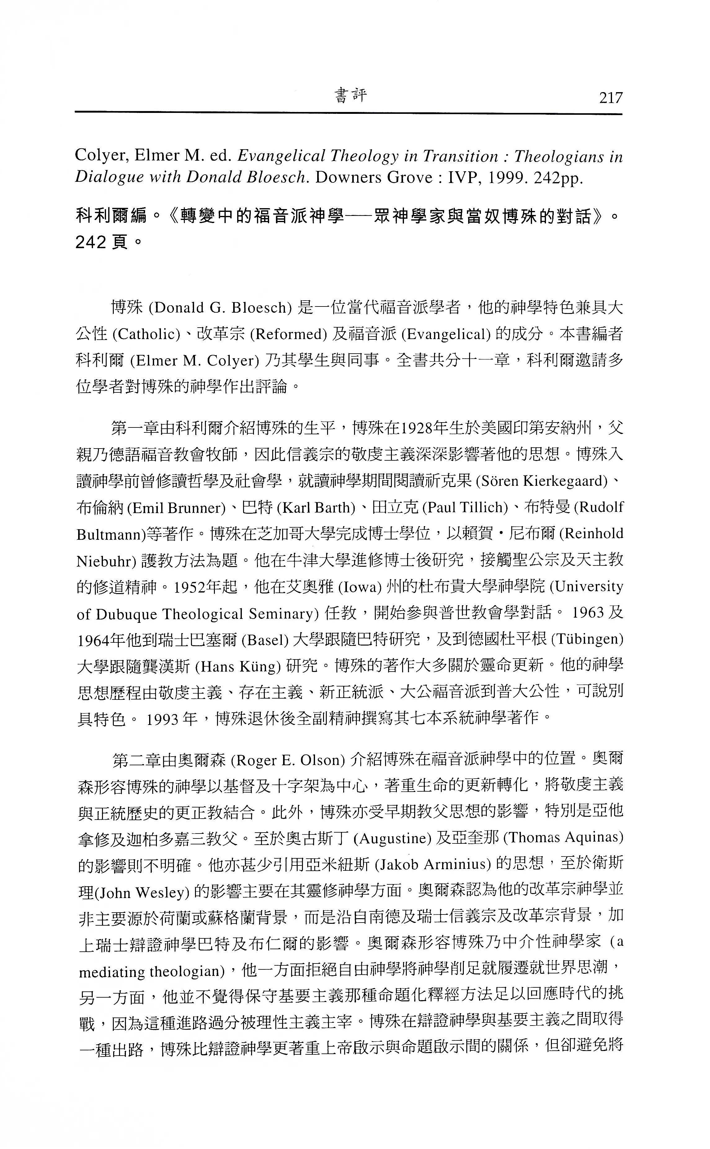科利爾編。《轉變中的福音派神學──眾神學家與當奴博殊的對話》。(Colyer, Elmer M., ed. Evangelical Theology In Transition : Theologians In Dialogue With Donald Bloesch.)/郭鴻標