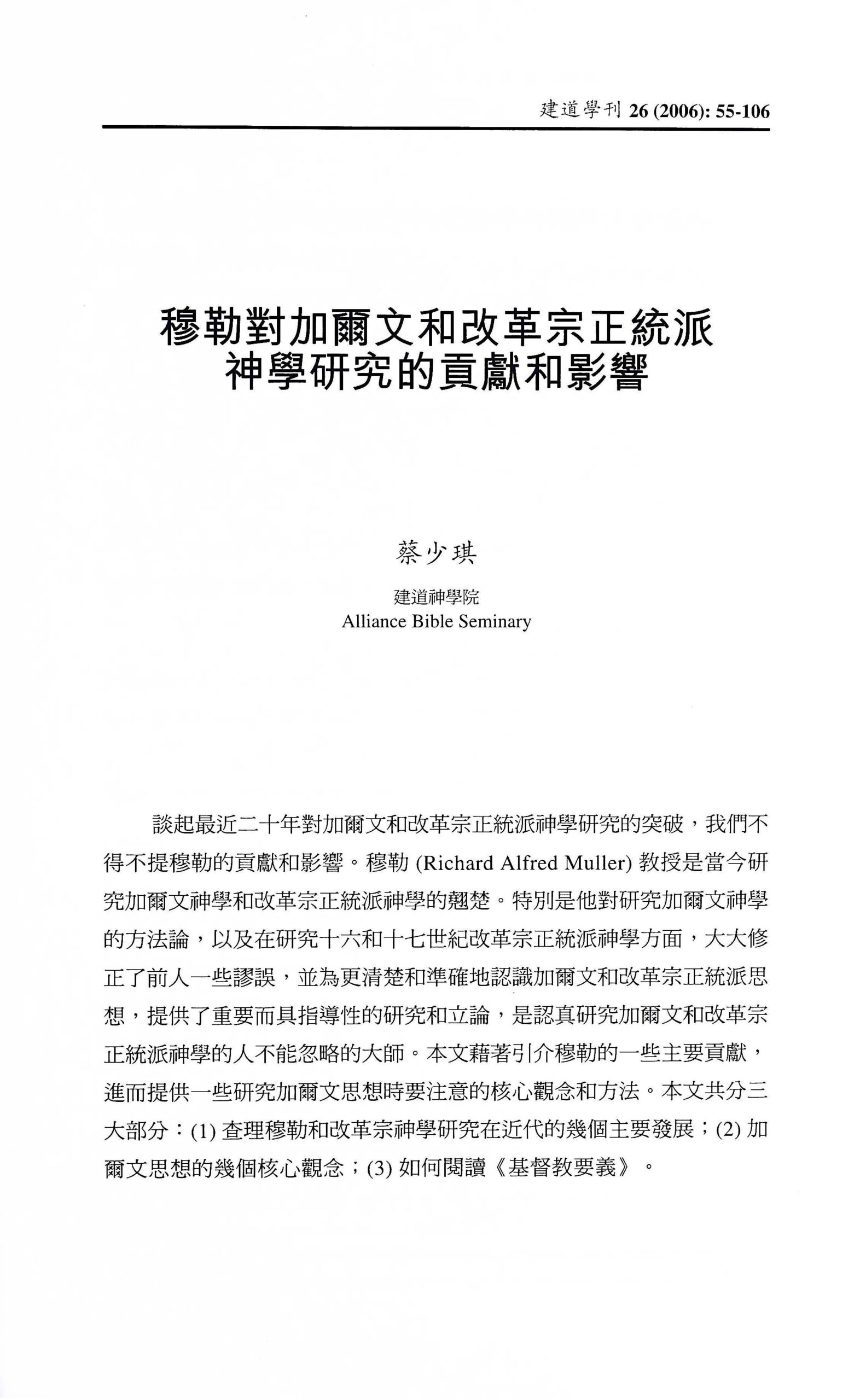 本文介紹了近代加爾文主義大師穆勒在加爾文和改革宗正統派研究的貢獻和影響。全文共分三部分:(1)穆勒和改革宗神學研究在近代的主要發展;(2)加爾文思想的幾個核心觀念;(3)如何閱讀《基督教要義》。作者在第一部分指出,穆勒承接了近代由歐伯曼推展的宗教改革神學研究的突破,強調要留心宗教改革與中世紀末神學發展的多線關係。穆勒也修正了自十九世紀末對加爾文和加爾文主義者關係的分析,指出我們不能視加爾文為改革宗神學的唯一奠基者,同時必須留意加爾文所使用的十六世紀神學用詞和框架。另外,穆勒也修正了對改革宗正統派與經院哲學之間關係的看法。在第二部分,作者指出穆勒曾多次強調必須在加爾文的歷史處境下研究加爾文;同時更引申穆勒的想法,指出若要正確理解加爾文,就必須注意加爾文是第二代的宗教改革家,而他本身也不是改革宗神學的唯一奠基者。早期的加爾文視自己為路德一派的晚輩,他不單受奧古斯丁思想的影響,也間接受中世紀奧古斯丁神學發展的影響。第三部分,作者引述穆勒的觀點,指出《基督教要義》是十六世的神學系統,我們必須留意它的功用和《基督教要義》與加爾文釋經工作的關係,以及墨蘭頓的方法論如何影響《基督教要義》的架構。在總結部分,作者申述穆勒有關加爾文神學和改革宗正統派神學的方法論的論說,並預期它在一段頗長的時間內,會影響加爾文神學及改革宗正統派神學的研究。