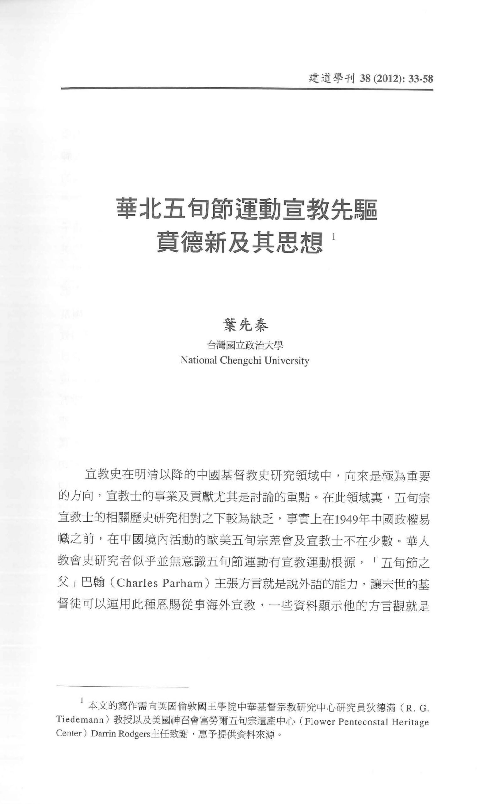 華北五旬節運動宣教先驅賁德新及其思想/葉先秦