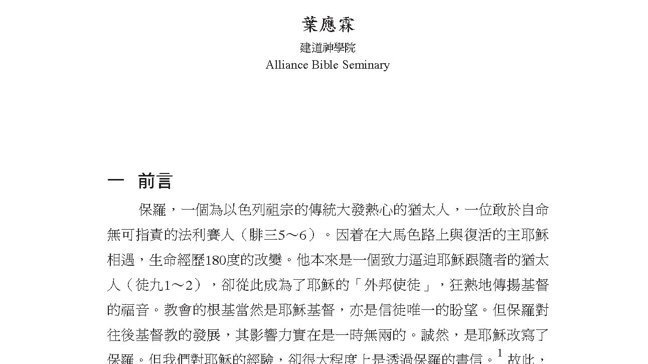 - 葉應霖。〈保羅神學「四角錦標賽」 — 從爭論到聯合〉。《建道學刊》58期 (2022),頁17-42。香港:建道神學院。