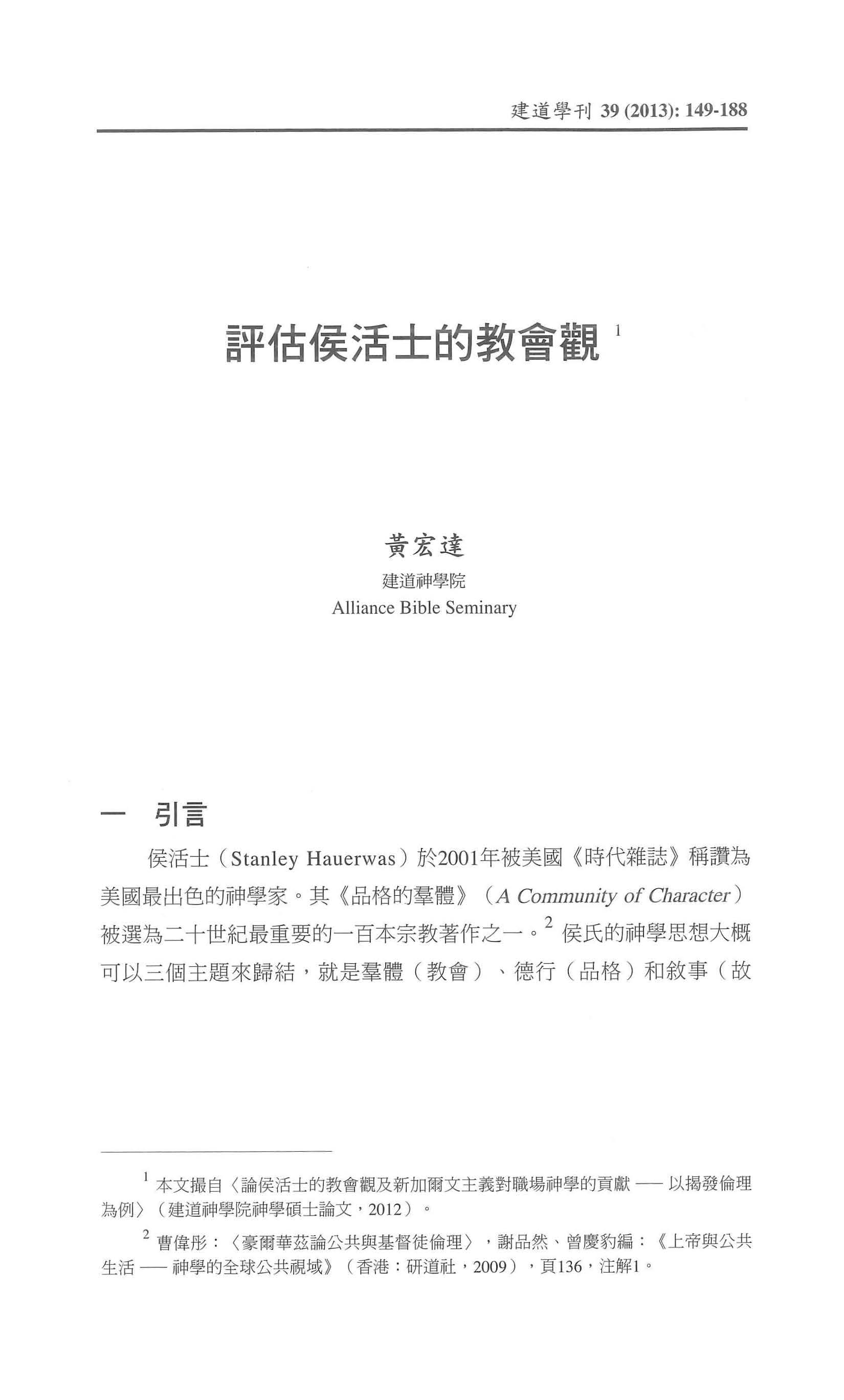 本文是對侯活士的教會論評估,並借助新加爾文主義的普遍恩典觀和教會論。本文指出侯氏的盲點有四,分別是把教會代替了聖經;混淆了特殊恩典與普遍恩典;忽略「教會作為有機體」的向度及無法發展一種能支持改變社會和有關策略的神學。另一方面,本文亦指出侯氏的教會論的特色是結合了成聖論,所以,教會倫理就是個人倫理。教會因而是個別信徒的群體性倫理資源。因此,侯氏的貢獻有二,分別是教會的群體屬靈智慧和經驗可以在複雜多變的倫理處境進程中指導信徒如何應用聖經的絕對原則,第二就是教會應該像支援宣教士一般受倫理困擾的信徒。