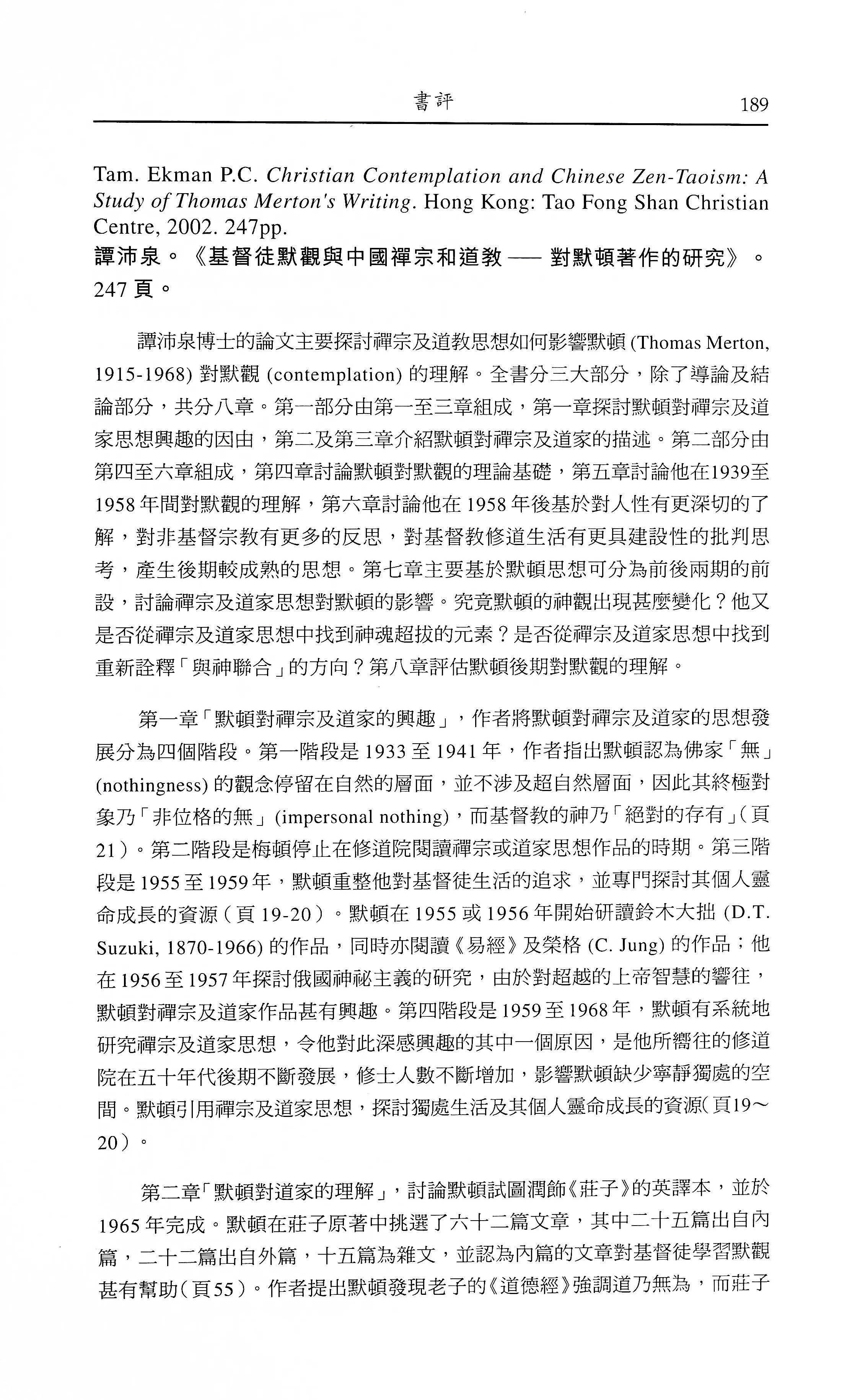 譚沛泉。《基督徒默觀與中國禪宗和道教──對默頓著作的研究》。/郭鴻標
