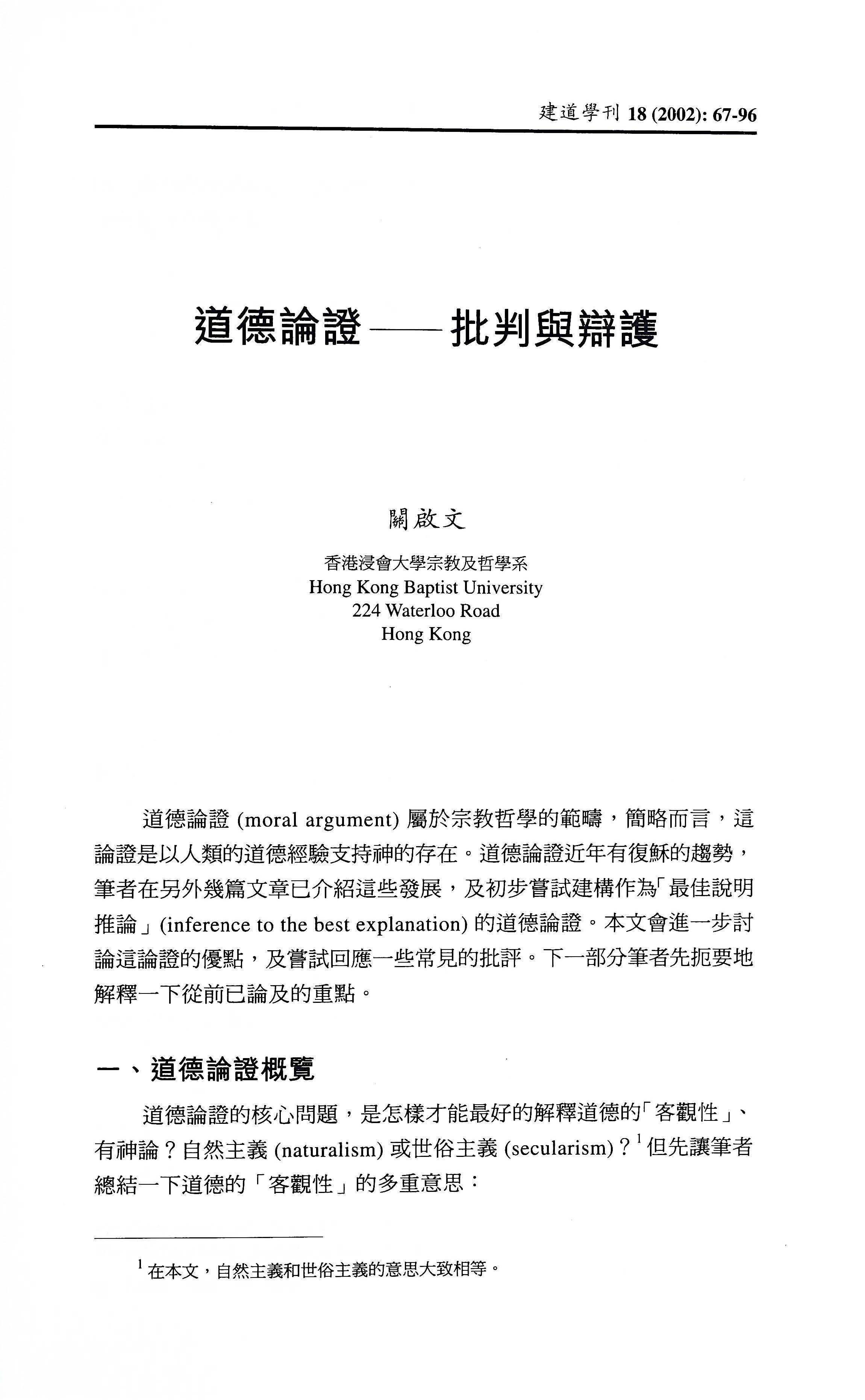 道德論證認為,我們的道德經驗能為神的存在提供支持,本文會勾劃道德論證的輪廓,並為它提出幾個支持的論點。第一,我們深刻的道德經驗(如良心的呼喚、罪咎感等)與有神論更融貫,而與自然主義不大吻合。第二,神本倫理以神人關係為中心,並非律法主義。第三,神本倫理能避免事實與價值的分割。第四,有神論世界觀和神本倫理有廣泛的說明能力,優於它的對手。文章接著列舉對道德論證常見的十四種批評,並逐一回應。最後的結論是:道德論證雖然不是決定性的證明,但它可成為支持神存在的累積論證的重要部分。