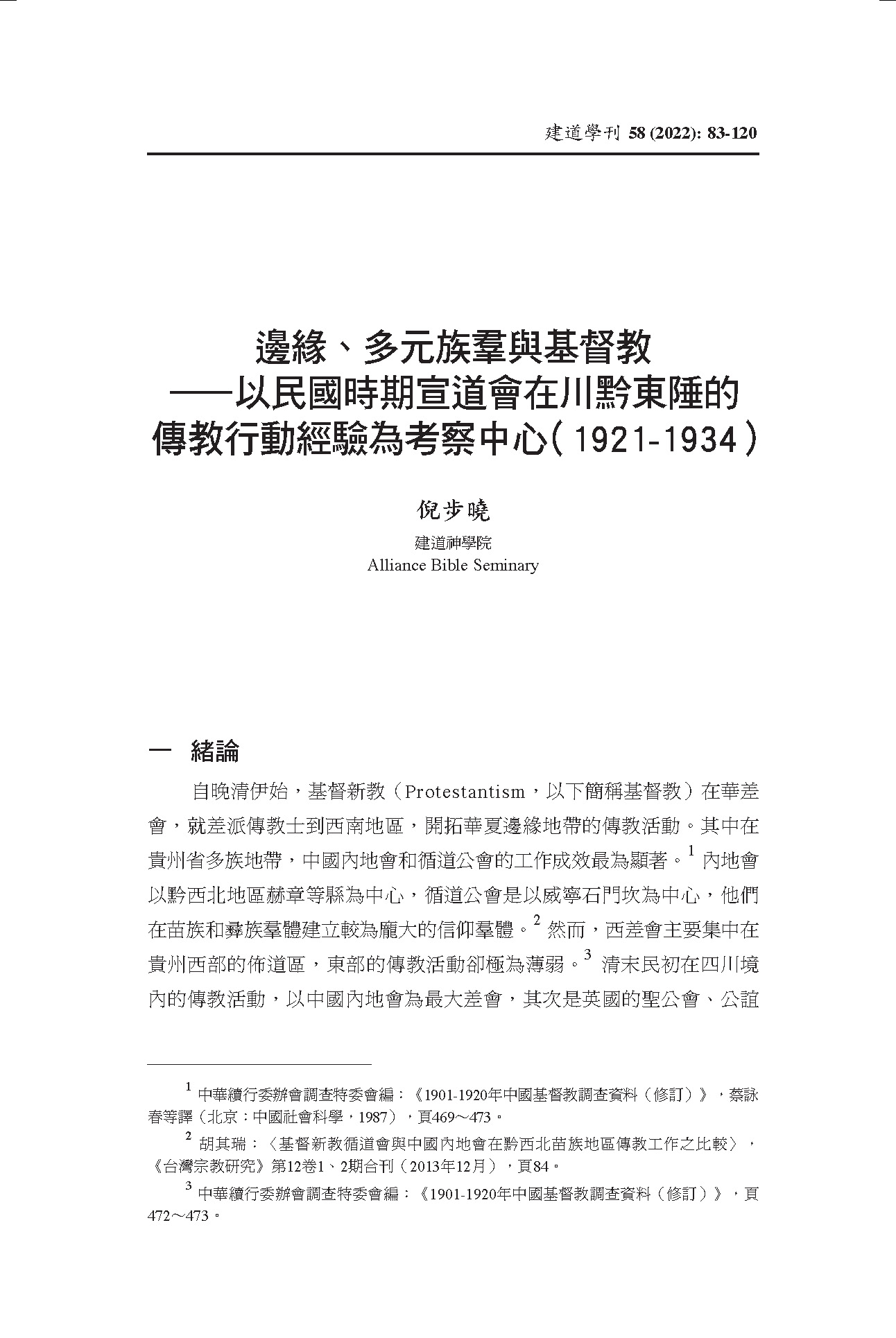 邊緣、多元族羣與基督—以民國時期宣道會在川黔東陲的傳教行動經驗為考察中心(1921-1934) / 倪步曉
