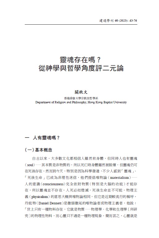 靈魂存在嗎?從神學與哲學角度評二元論 / 關啟文