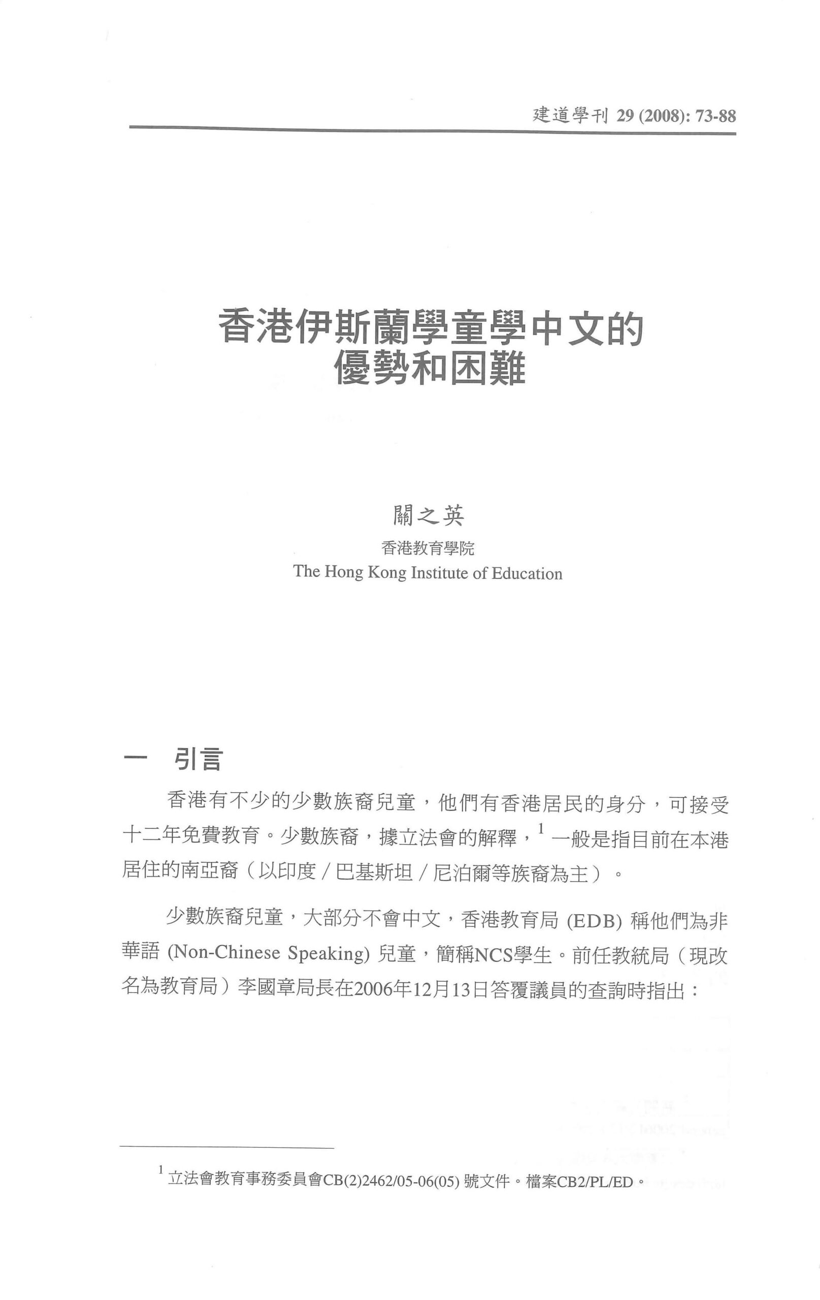 香港伊斯蘭學童學中文的優勢和困難/關之英