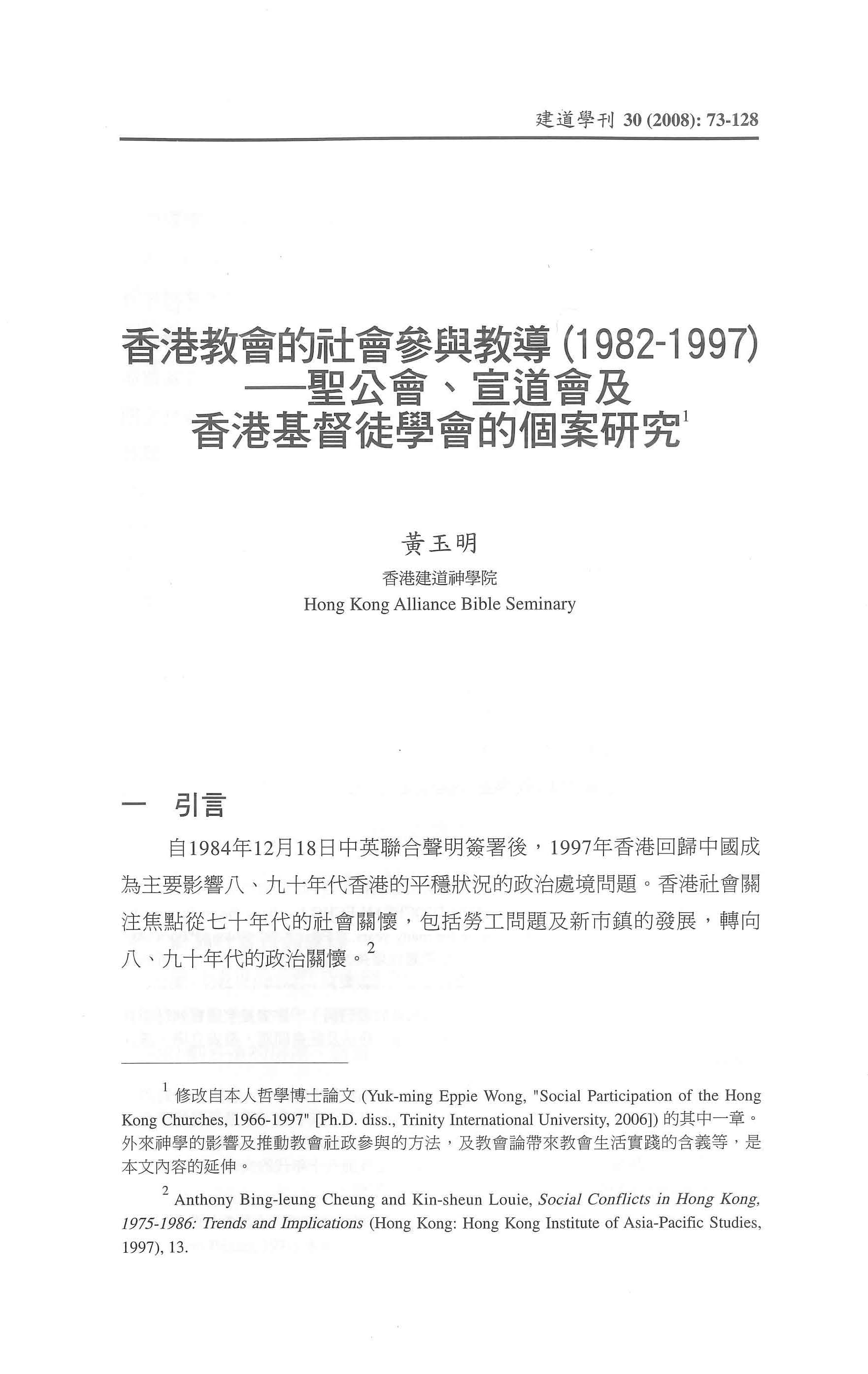 香港教會的社會參與教導(1982-1997)──聖公會、宣道會及香港基督徒學會的個案研究/黃玉明