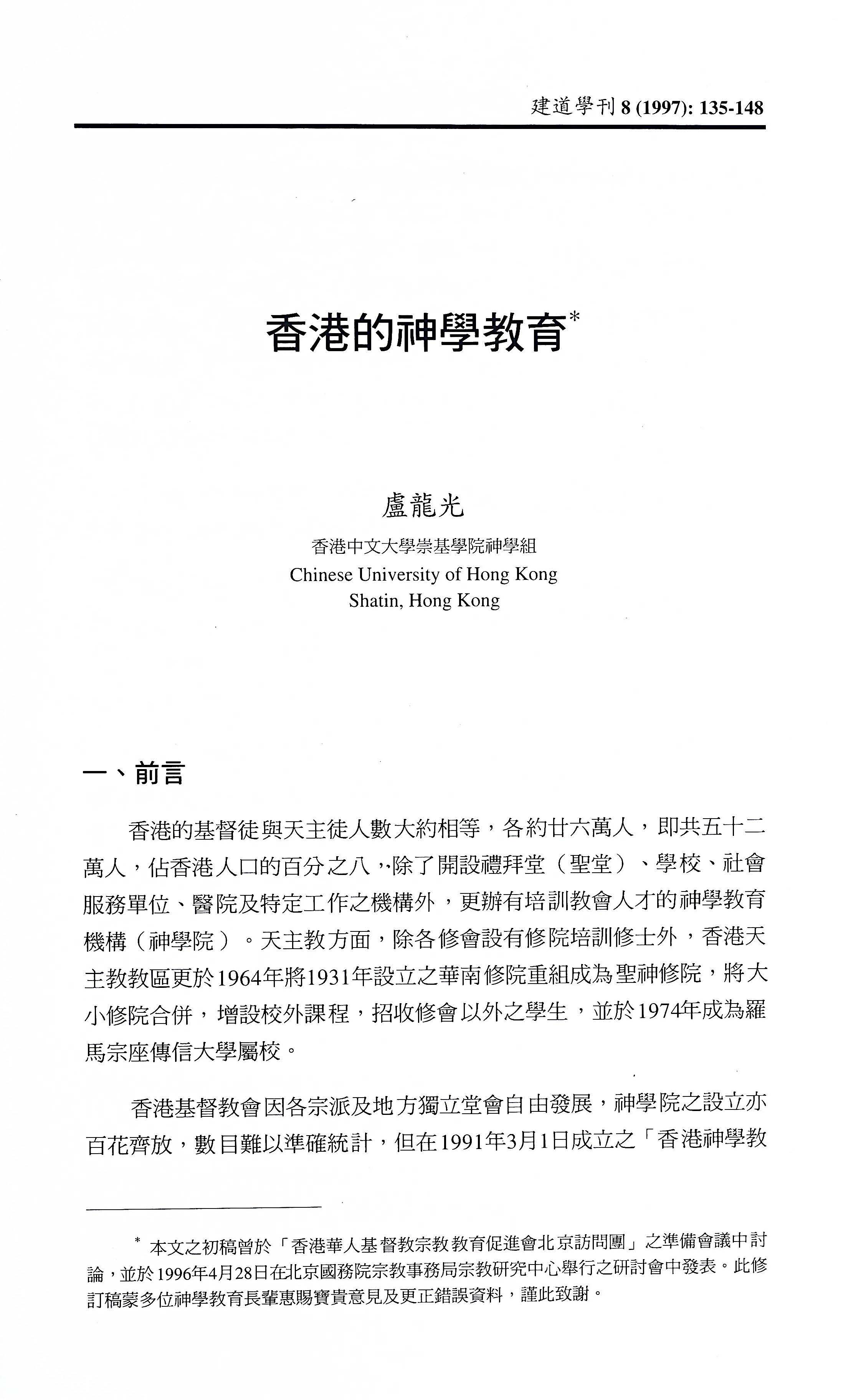 The number of Catholics and Protestants in Hong Kong is more or less the same, each has around 260,000. The Catholic Church started the Holy Spirit Seminary in 1964. Owing to the diversity of Protestant seminaries. 11 seminaries are admitted as members of the Hong Kong Theological Education Association and that include all the major seminaries. Among them, 8 could trace their origins back to mainland China. The purpose of theological education in Hong Kong is not only to train pastors but also laymen and to pursue academic research. Among the 80 strong teachers, 90% are Chinese. There are more than one thousand students. Most of the seminaries rely on funds raised in Hong Kong. In the future, emphases on inter-disciplinary approach, academic research, developing contextualized/indigenous theology and establishing a Chinese theological exchange network are expected.