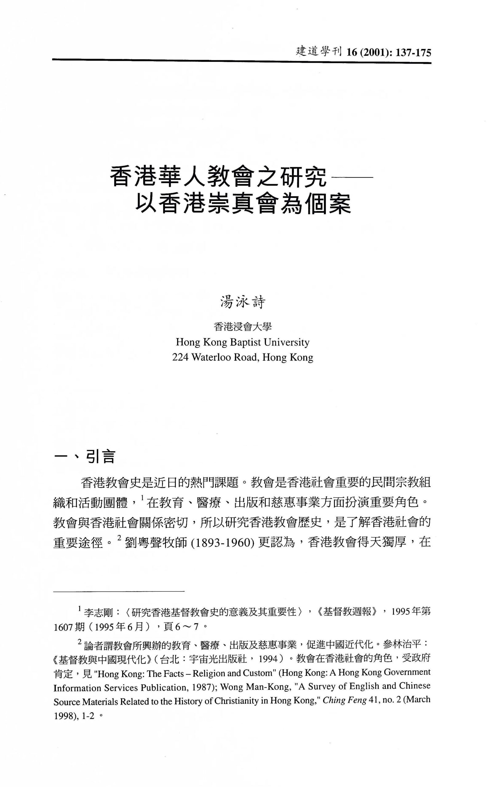 香港華人教會之研究──以香港崇真會為個案/湯泳詩
