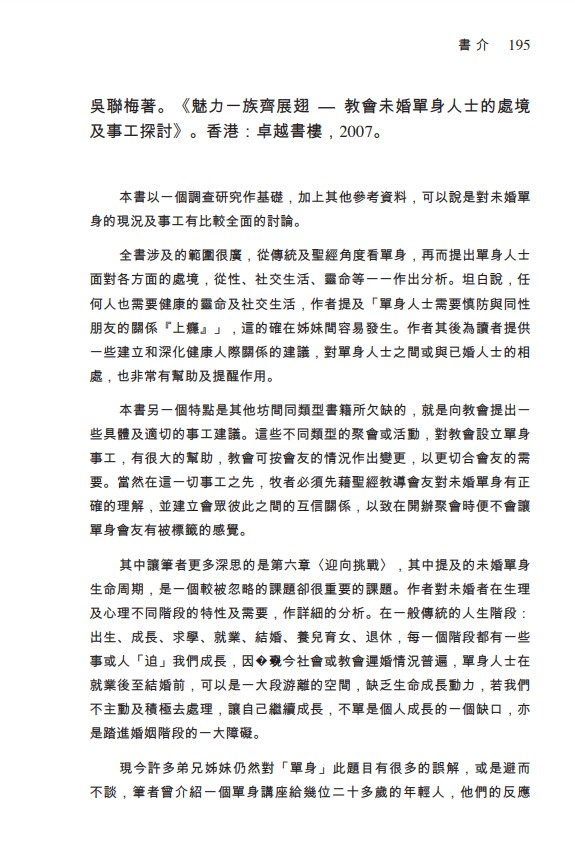 吳聯梅著。《魅力一族齊展翅–教會未婚單身人士的處境及事工探討》。香港:卓越書樓,2007。