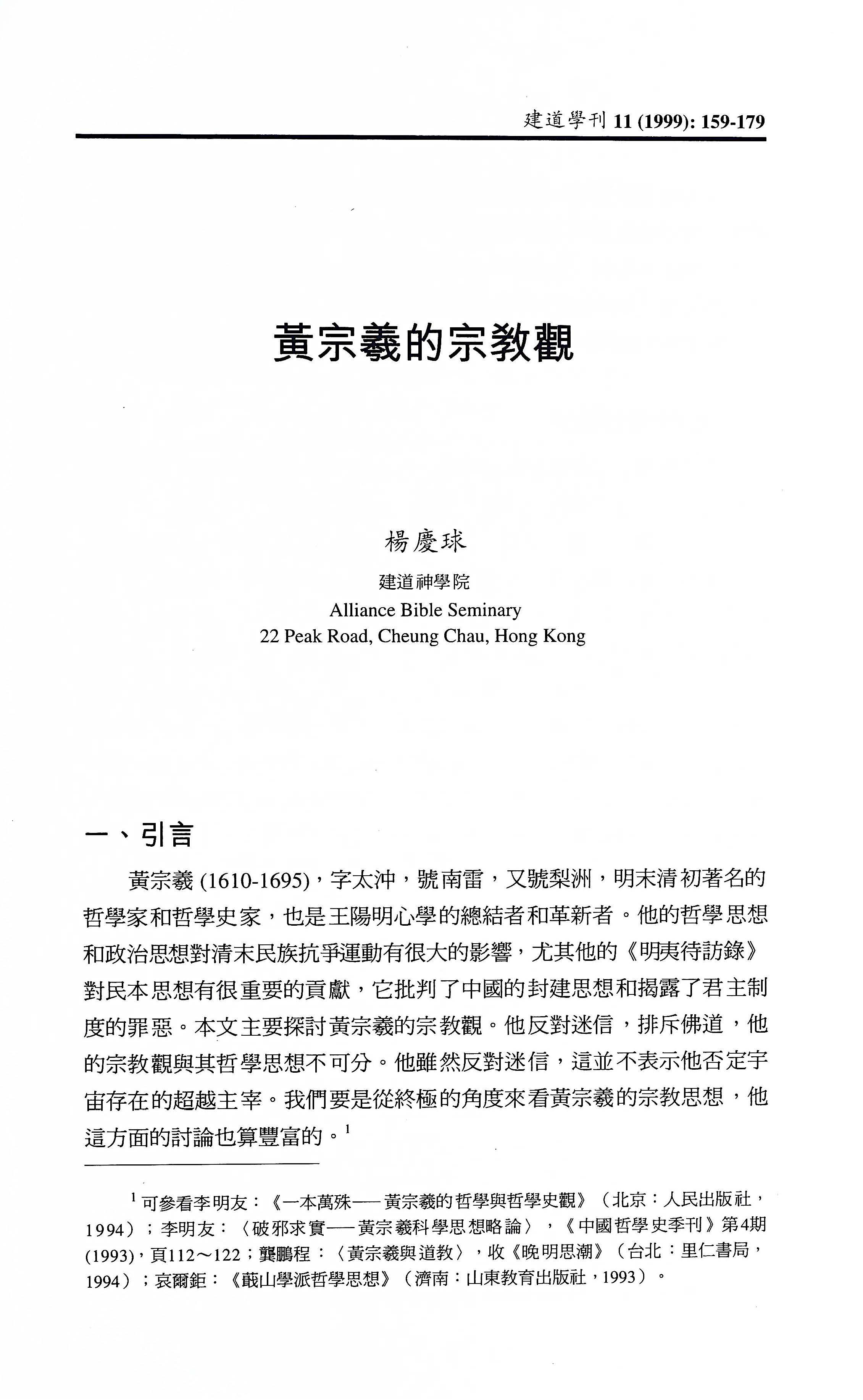 本文主要探討黃宗羲(梨洲)的宗教思想。梨洲繼承儒家心性觀,但卻避免了心統有萬物的唯心思想,他肯定世界的客觀實有,這就是氣。他肯定理在氣內,而心與氣相通,這使他無去接受佛教的「空」,及道教的「無」。世界實有是氣, 氣至尊的稱謂就是上帝,祂是創生宇宙萬物又賦予萬物的規律。這相當於西方的自然神論(Deism)。梨洲雖然不相信一位人格神,但這種宇宙實有的觀念,使他對超越的上帝有一定的肯認,這種肯定與心性論產生張力,但卻是外王事工的預設理論。上帝是萬有至尊的稱謂,祂本身是一秩序,凡合於序的就是善,不合於序的就是惡。惡是反常的現象,是暫時的;善是宇宙流行的最終目的,外王事工就是如何循序去建立文化生活。而序的來源出於心,這是心與上帝相通,上帝既是超越又是內在的,這是梨洲宗教觀的特色。