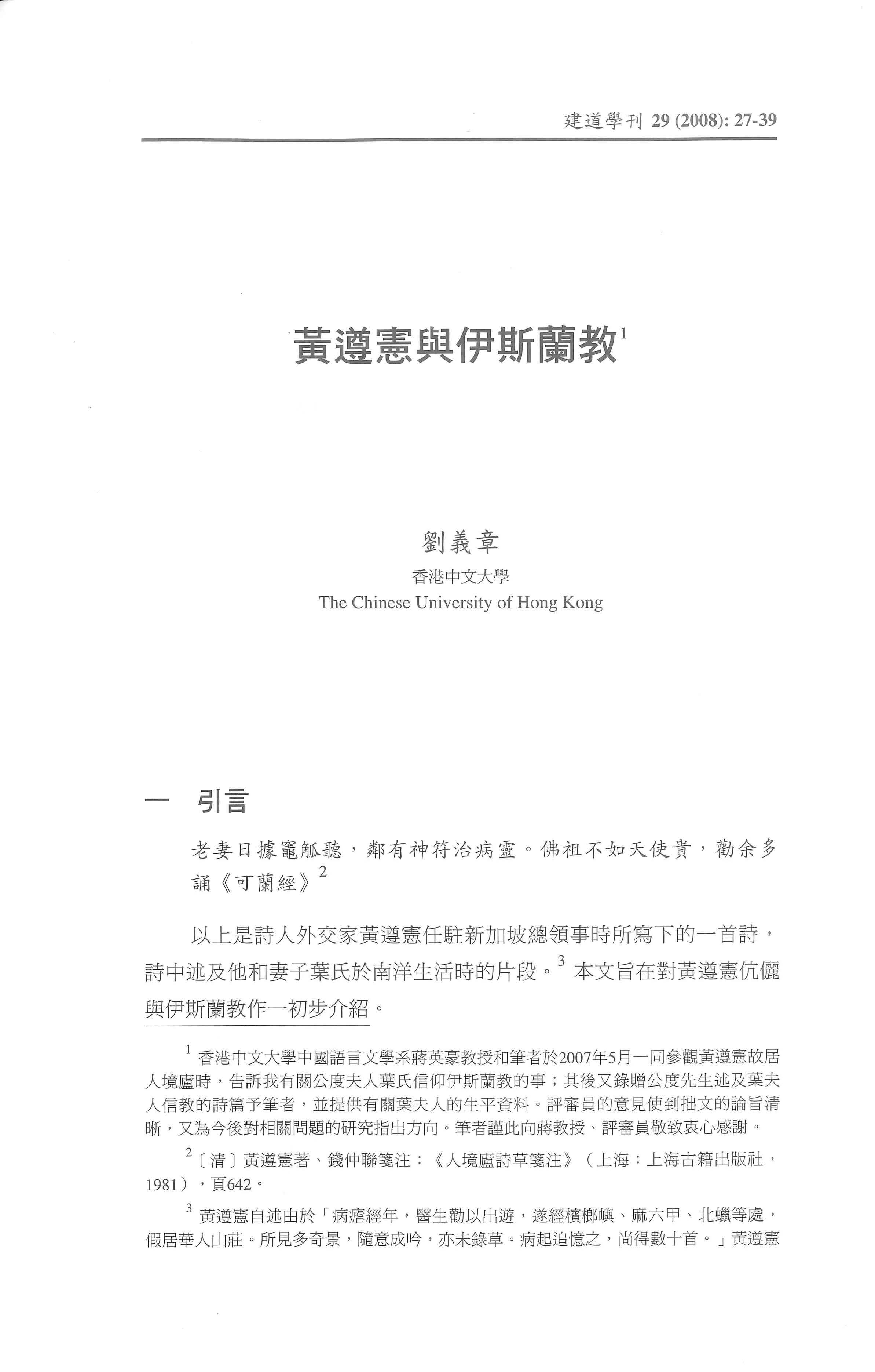 本文旨在對黃遵憲( 1848至1905年)與伊斯蘭教的關係作一初步介紹。黃遵憲是近代中國一位著名外交家、維新思想家和詩人,歷任駐日使館參贊、美國舊金山總領事、英國使館參贊、以及駐新加坡總領事。文章嘗試從黃遵憲的詩觀察他對伊斯蘭教以及其他宗教的看法。此外,他亦有詩描寫與妻子葉氏在新加坡時的生活片段,其中有一首述及葉氏勸他多誦《可蘭經》。筆者希望以此為開端,就歷史上士大夫、漢民族包括客家人對伊斯蘭教的取態,以及信奉伊斯蘭教的兄弟民族與漢族在通婚和宗教信仰等方面的互動情況,作進一步探討。
