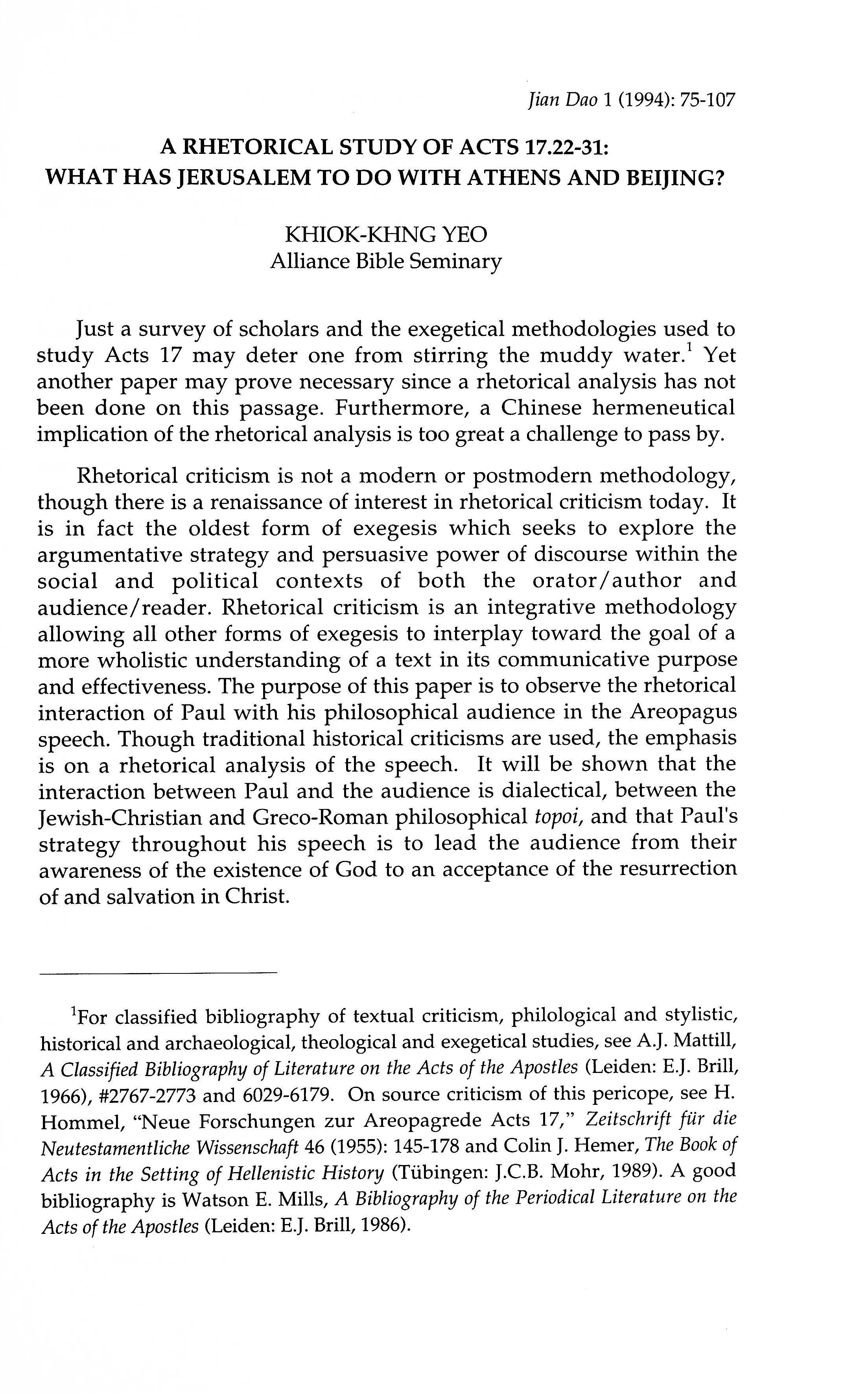 A Rhetorical Study Of ACTS 17:22-31: What Has Jerusalem To Do With Athens and Beijing? (使徒行傳十七章22至31節之修辭學──耶路撒冷、雅典、北京) / 楊克勤