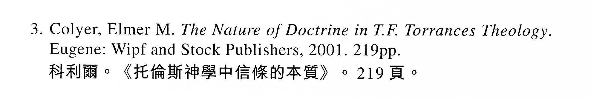 科利爾。《托倫斯神學中信條的本質》。(Colyer, Elmer M. The Nature Of Doctrine In T.F. Torrances Theology.)/郭鴻標