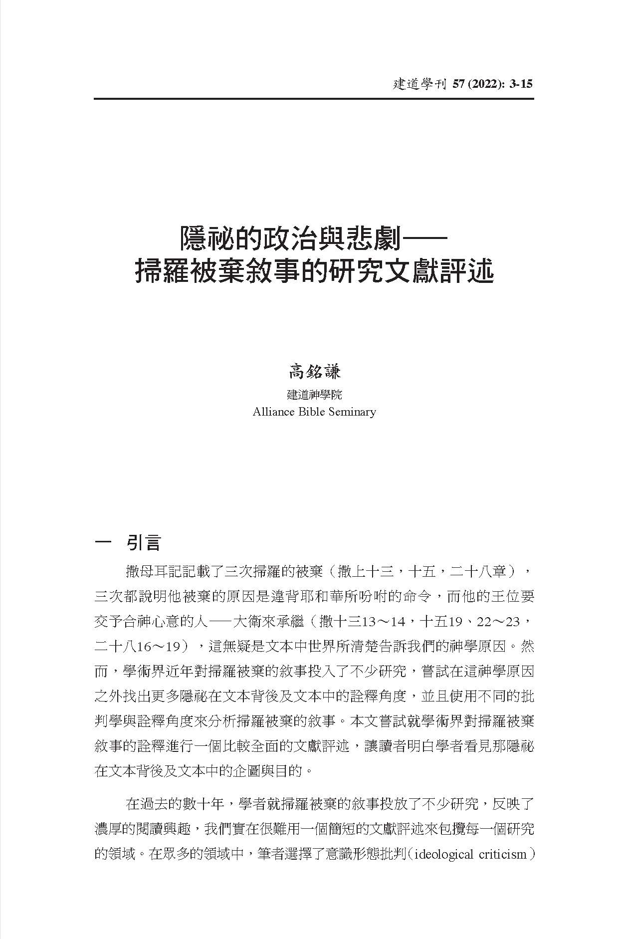 隱祕的政治與悲劇—掃羅被棄敘事的研究文獻評述 / 高銘謙