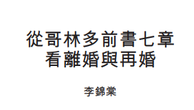 哥林多前書第七章是新約其中一段較具體提及離婚與再婚的經文,本文作者透過保羅的思想期望讀者可以不為現今社會的相對道德觀左右,在面對婚姻困難時懂得察驗何為神的旨意。…