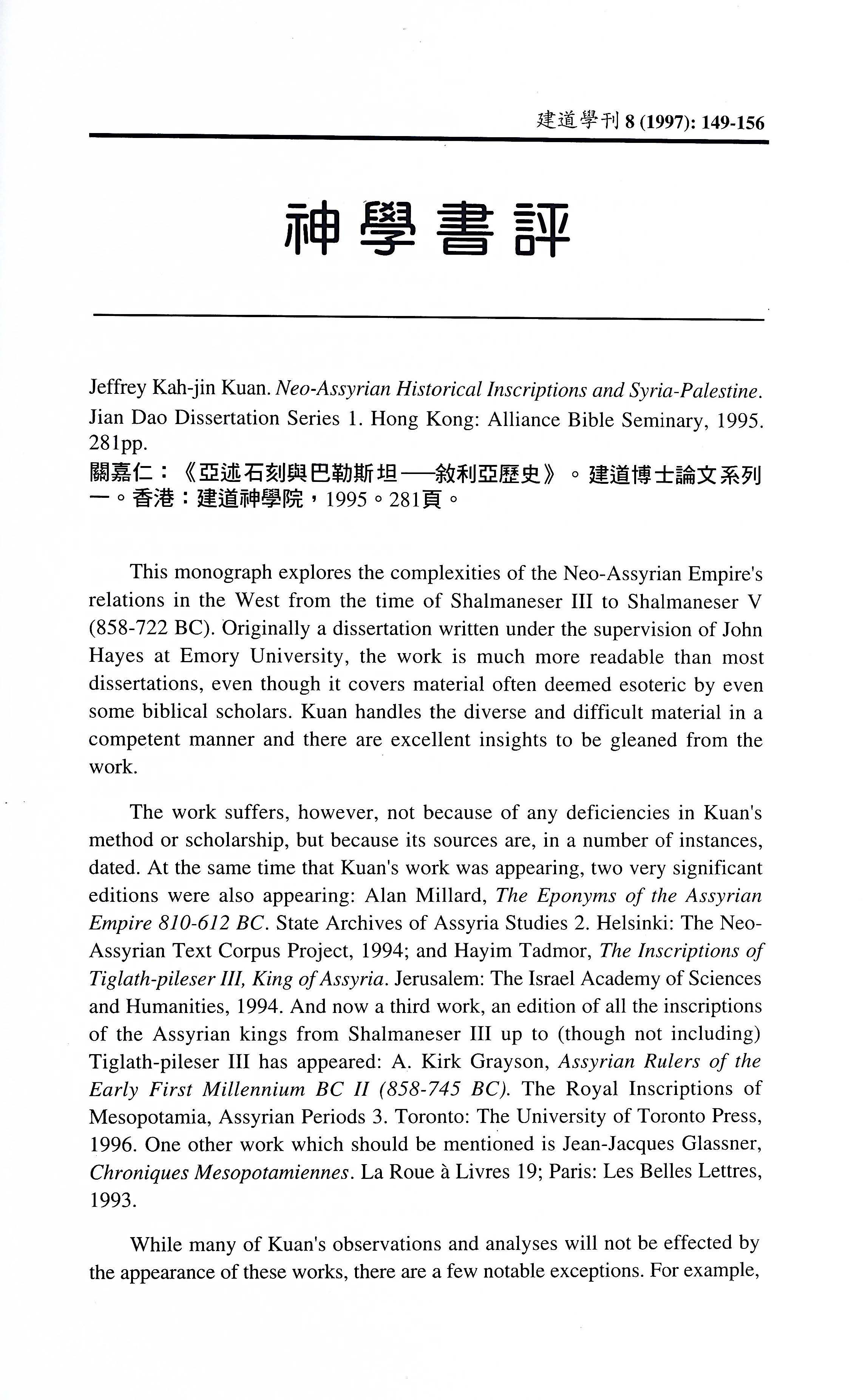 Kuan Jeffrey Kah-jin. Neo-Assyrian Historical Inscriptions And Syria-Palestine.(關嘉仁。《亞述石刻與巴勒斯坦──敘利亞歷史》。) / K. Lawson Younger 楊格