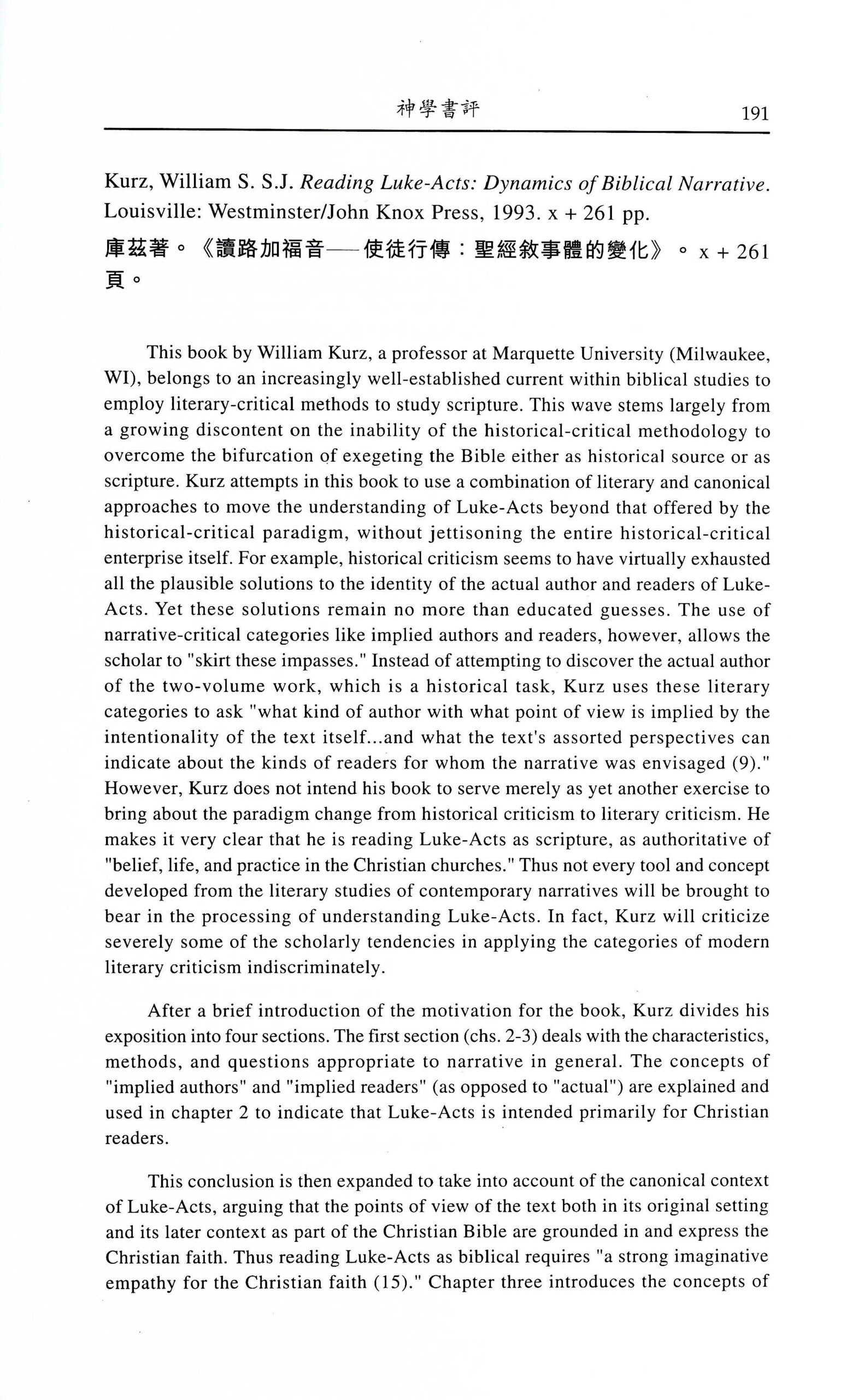 Kurz, William S, S.J. Reading Luke-Acts: Dynamics Of Biblical Narrative.(庫茲。《讀路加福音──使徒行傳:聖經敘事體的變化》。) / 張雲開