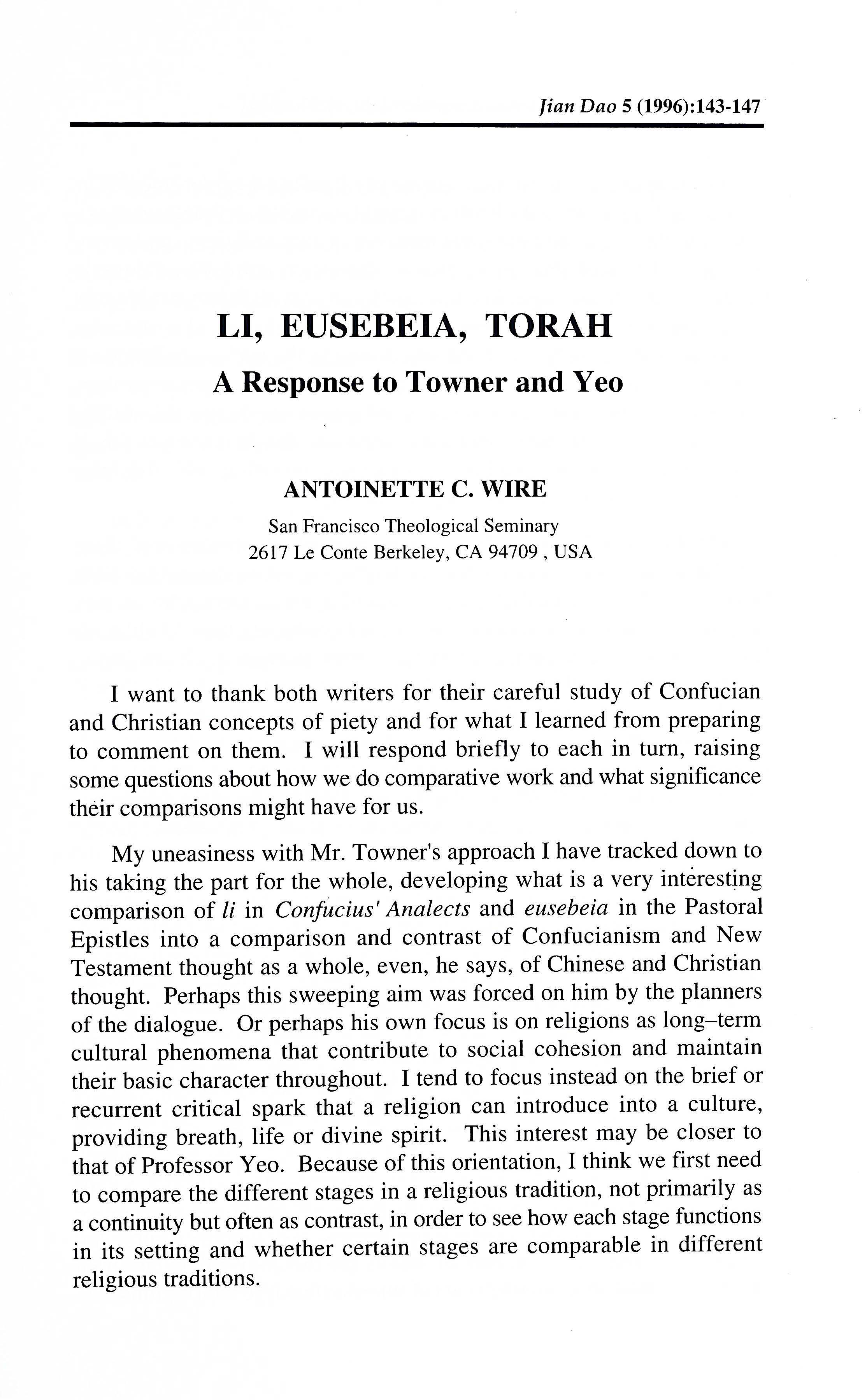 LI, EUSEBEIA, TORAH: A Response To Towner And Yeo(禮、敬虔、律法──回應唐氏與楊氏之文章) / Antoinettec Wire 懷安托瓦尼特