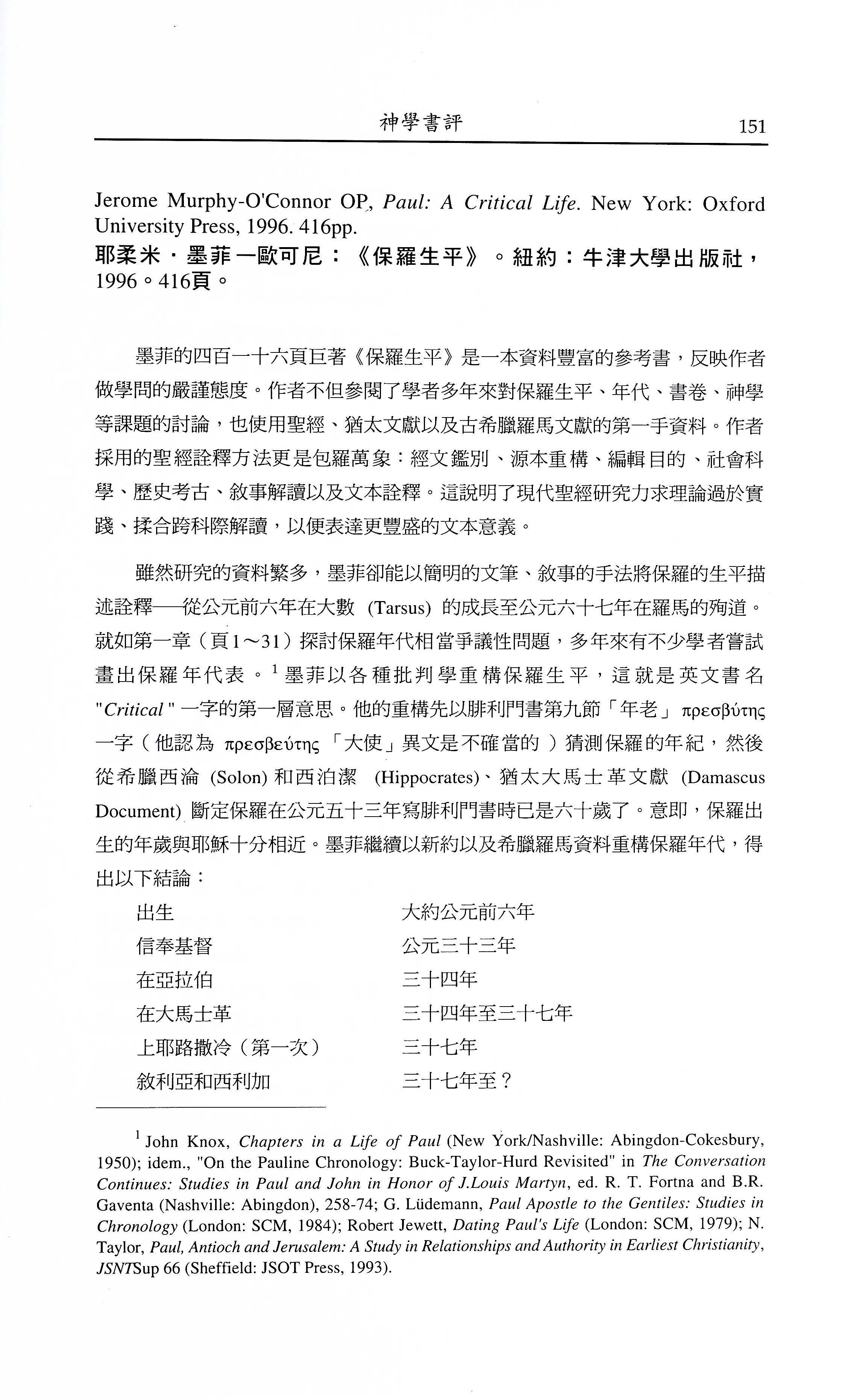 Murphy-O’Connor Op Jerome. Paul: A Critical Life.(耶柔米‧墨菲─歐尼可。《保羅生平》。) / 楊克勤