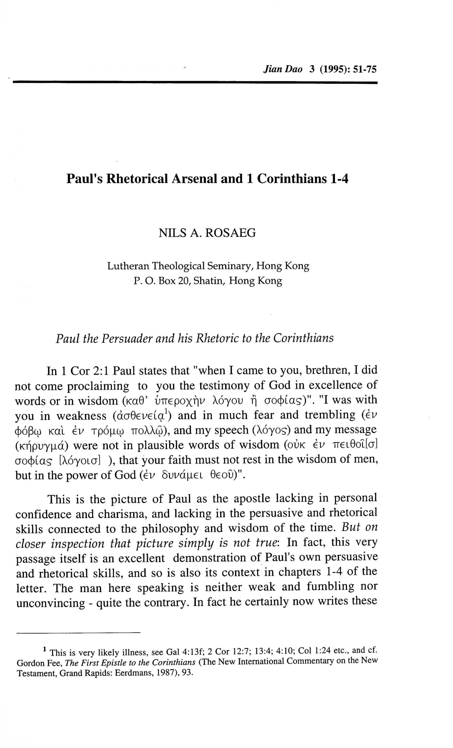 Paul's Rhetorical Arsenal And 1 Corinthians 1-4 (保羅修辭技巧與哥林多前書1至4章) / Nils A. Rosaeg 盧碩