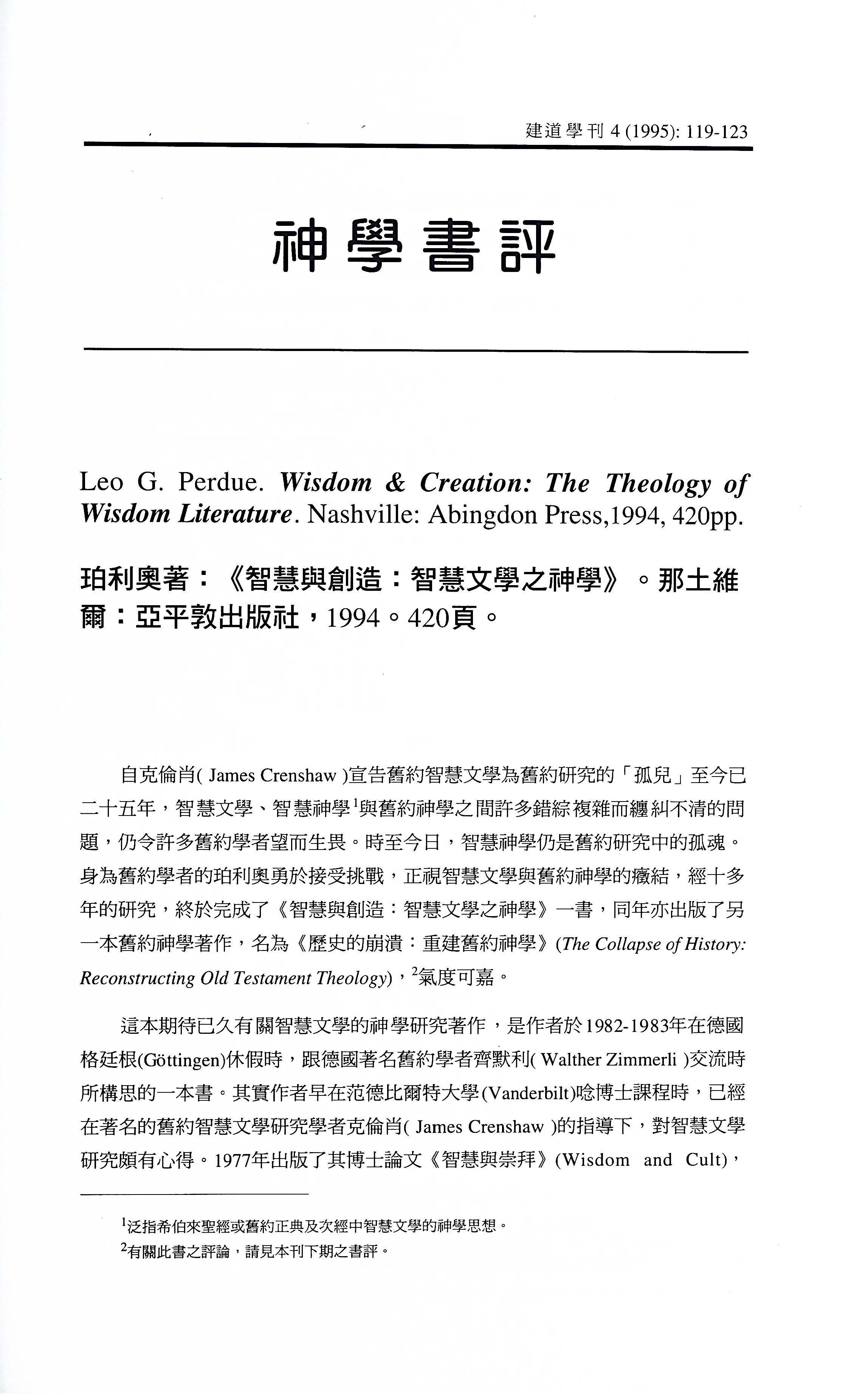 Perdue, Leo G. Wisdom and Creation: The Theology of Wisdom Literature.(珀利奧。《智慧與創造》。) / 謝品然