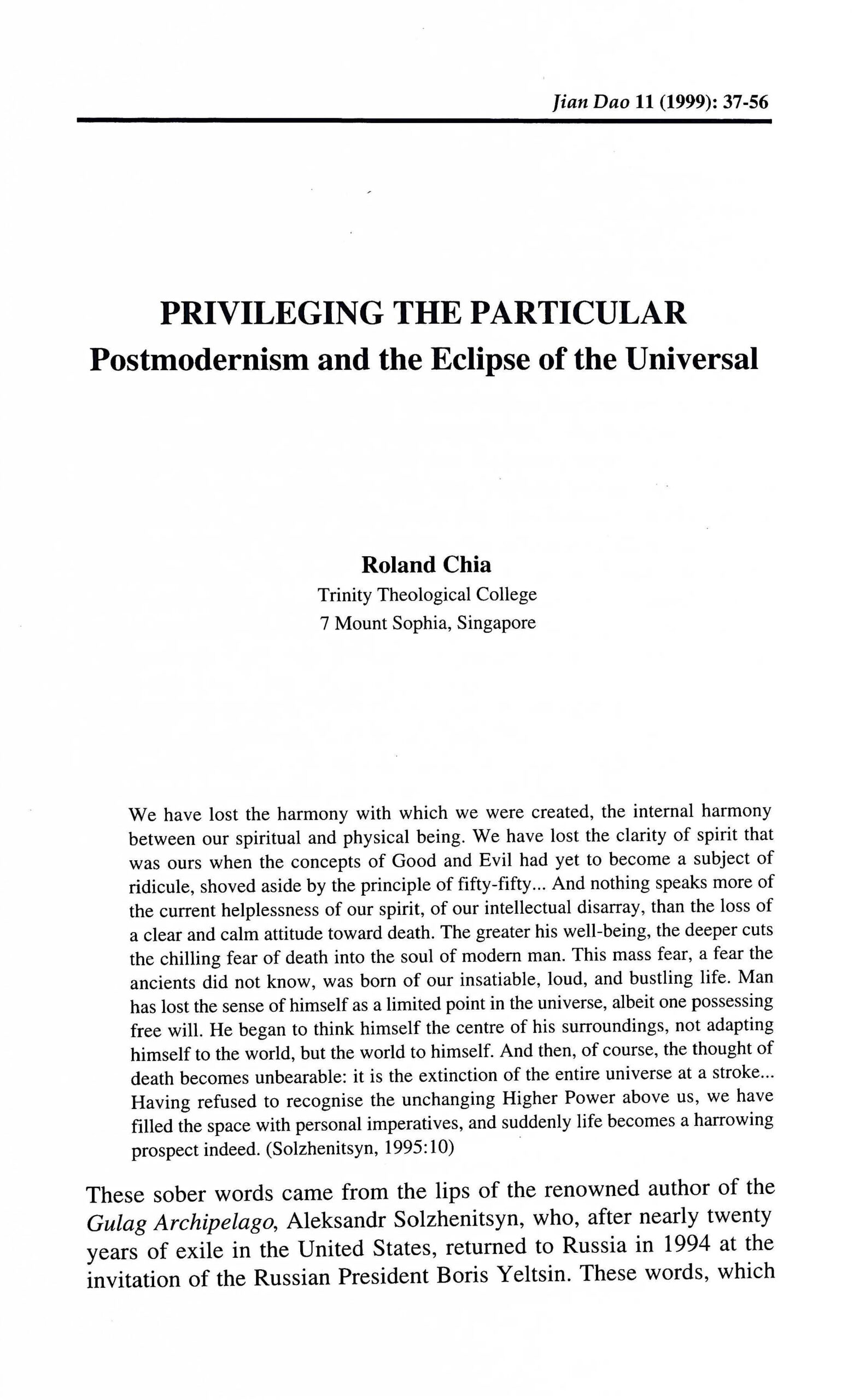 The culture that we inhabit is sometimes called “postmodern”. This essay explores the various characteristics of the postmodern ethos, especially the postmodern tendency to privilege the particular and marginalise the universal and its impact on theology. Thinkers such as Lyotard and Derrida are examined critically in this article, as is the a/theology of Mark C. Taylor. The essay argues that the insight of Aleksandar Solshenitsyn with which the essay began accurately describes the culture of postmodernism, for even as this culture privileges the particular and eclipses the universal, it displaces God as the centre of reality, and in its decentred existence, anarchy and nihilism reigns.