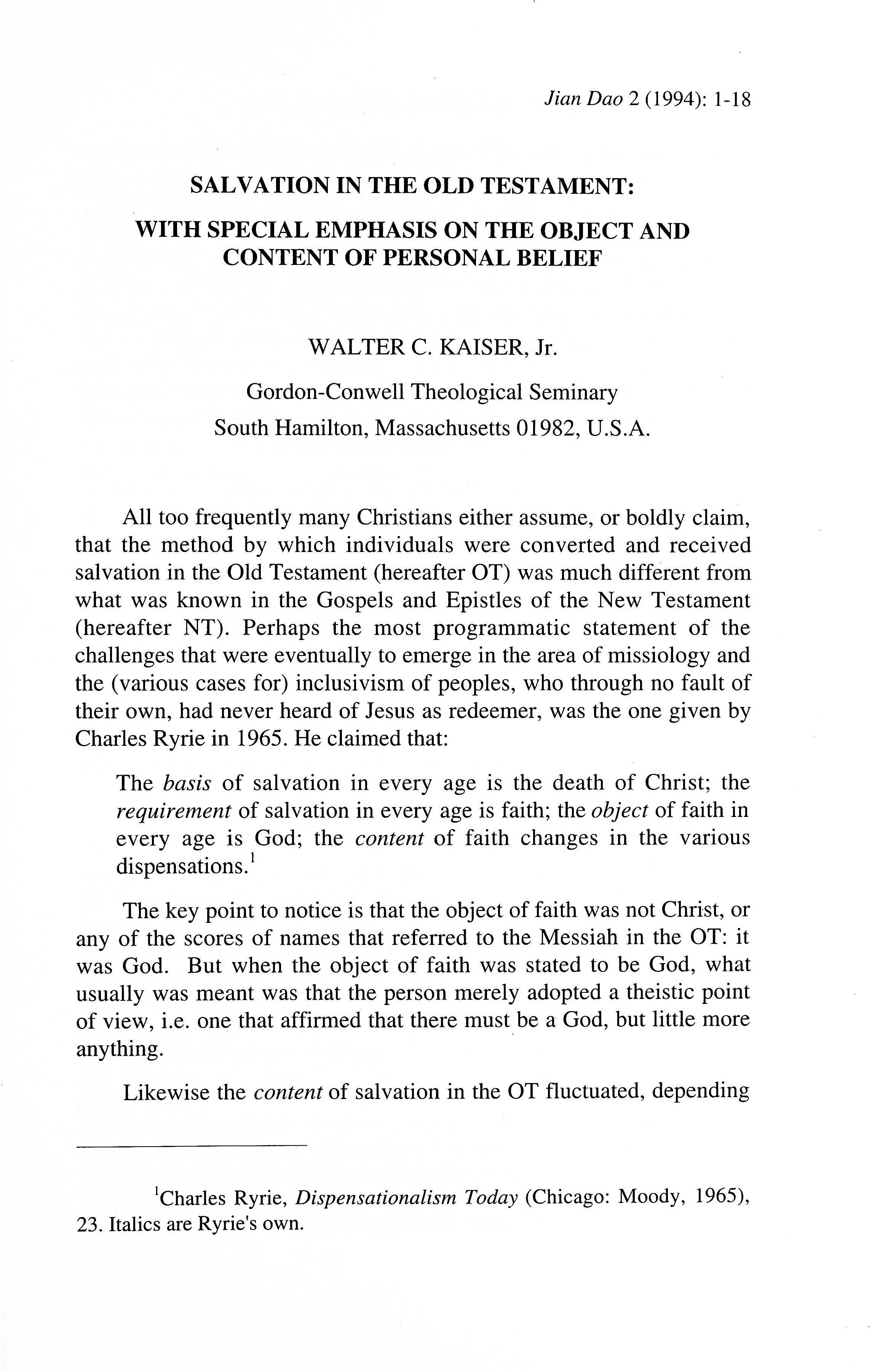 This article probes into the object and content of personal belief with reference to the salvation in the Old Testament. Kaiser examines various topics such as Salvation by Means of Grace (Exod 34), Salvation Through the Regenerating Work of the Holy Spirit, Salvation Grounded in the Man of Promise (Gen 15), Salvation Provided by the Blood of a Substitute (Exod 12; Lev 16), Salvation Resulting in Justification by Faith (Gen 15; Hab 2),OT Salvation as Sanctification to a Life of Holiness (Lev 19), Salvation Anticipating the Resurrection from the Dead (Isa 26) and concludes that OT object of hope was no less the same strong Son of God that we have also been taught to look to in the NT. Kaiser argues that not only that many remote or “hidden peoples” in the world, who are “informationally B.C.” but “chronologically” A.D., be saved by committing themselves to faith in God as Abraham and the rest of those who were chronologically B.C. did (Heb 11), they could also lay claim to eternal life with the Savior even though they could only point to the fact that there must be a God somewhere. The reason why these “informationally” uninformed peoples can be credited with this salvation is because that is what most contemporary Christians believe that the OT saints understood about being “saved” in the OT.