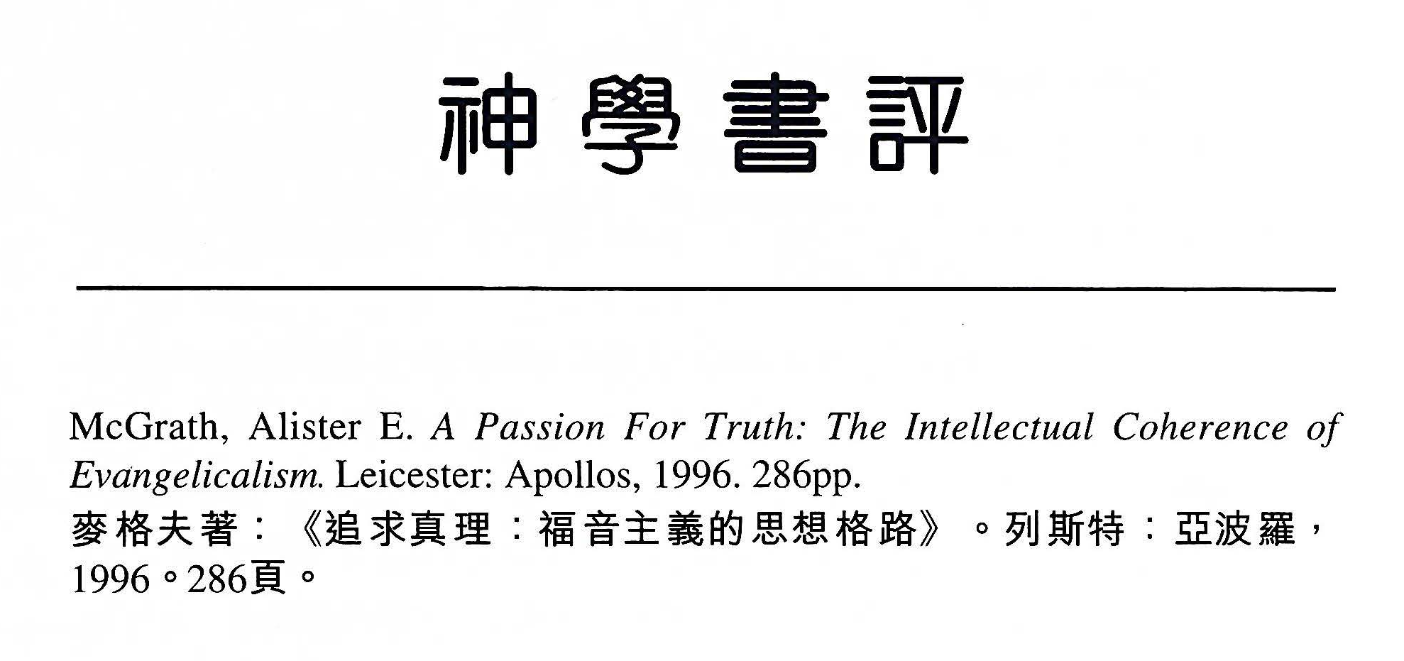 麥格夫。《追求真理:福音主義的思想格路》。(McGrath, Alister E. A Passion For Truth: The Intellectual Coherence Of Evangelicalism.) / 梁家麟