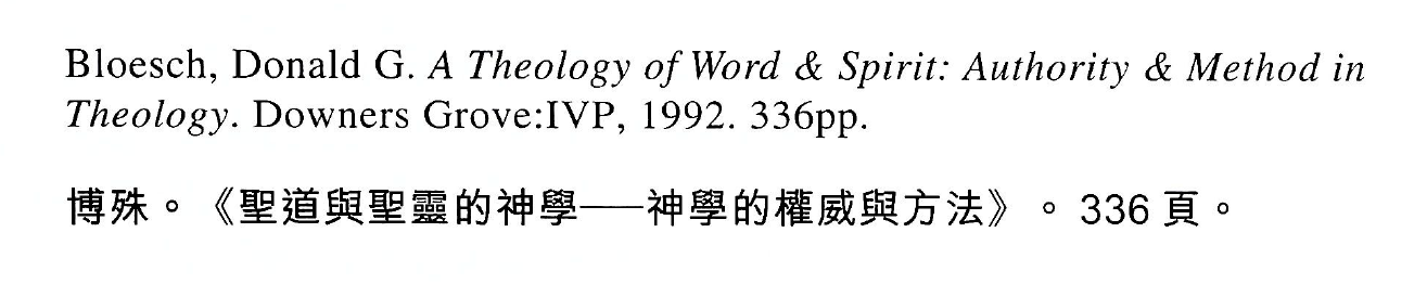 博殊。《聖道與聖靈的神學──神學的權威與方法》。(Bloesch, Donald G. A Theology Of Word & Spirit: Authority & Method In Theology.)/郭鴻標