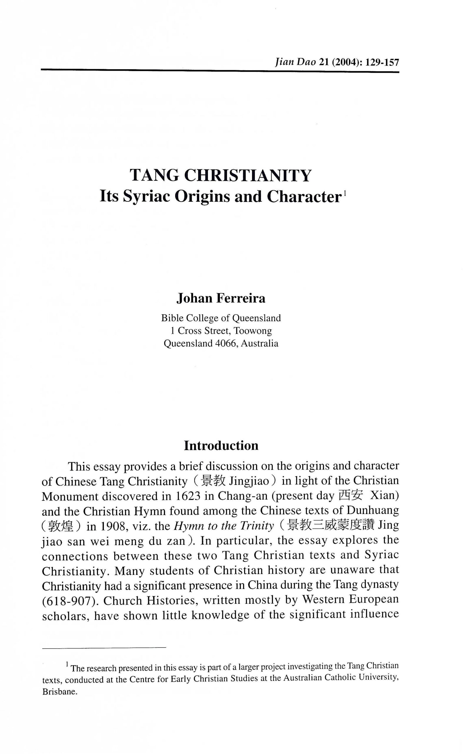 The paper provides an investigation into the origins and character of Tang Christianity in light of the Tang Christian Monument and the Christian Hymn from Dunhuang. After a brief survey of the history of research and a concise description of Syriac Christianity, it offers a comparsion between the religious sentiments and language of the two mentioned Tang Christian texts and Syriac Christianity. The paper argues that Tang Christianity has been misunderstood by applying the Nestorian label to it. Instead, Tang Christianity reflects Syriac traditions and should be undertsood in its own right.